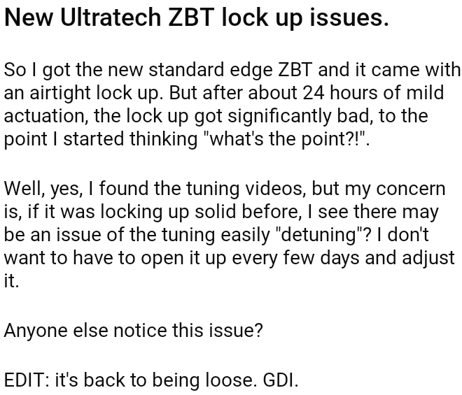 >>967577 Blur производят в гигантских количествах, каким-нибудь бенчам такие обьямы и не снились. Где-то на уровне кухонных ножей трамонтин. Неудивительно что косяк попался. Но при всей моей любви к сабжу, он устарел. А производитель почему-то меняет только сталь, а улучшить эту ЕБАНУЮ ПРУЖИНУ которая ломается по кд, или наконец начать вставлять шарик детента для него неподьемное ноу-хау. Трэк-тэк нещадно дерет карман, рекурва неудобно точится, клинки толстовато сведены. 14c28n не такой уж и твердый как хотелось бы. Так что мои два блюра живут на полке, а не на кармане.