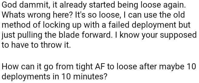 >>967177 Да хуй бы с ним, я бы больше беспокоился из чего там сделан алюминий, который держит упорную бонку, по которой каждый раз хуярит напружиненный клинок.