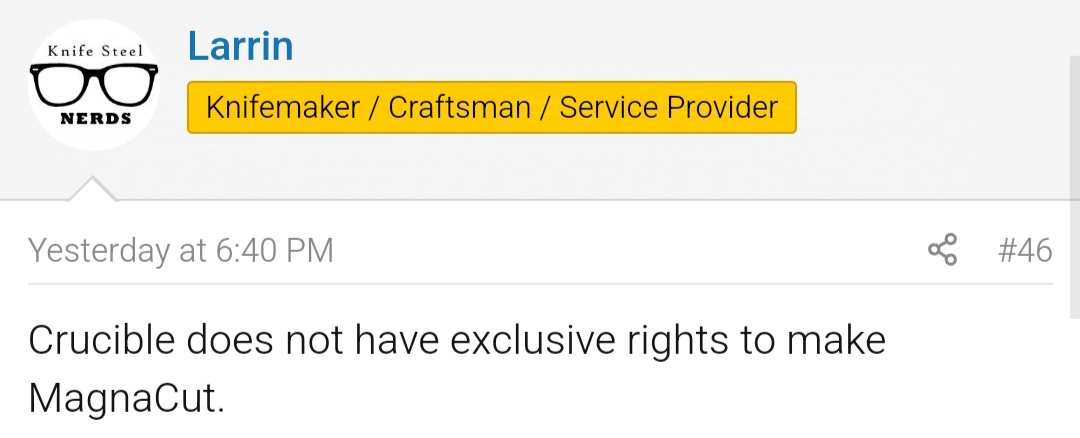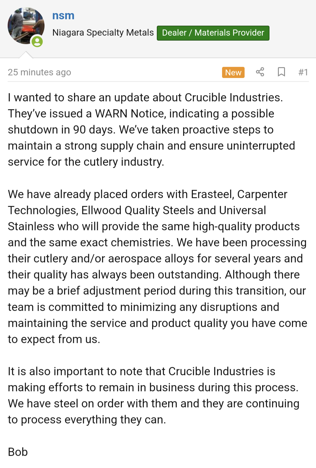 >>967114 >каких он говорит магнитах Учитывая неформальный язык и автопереводчик, чёрт знает, что там было на самом деле про магниты. На bladeforums есть тред, где задались вопросом "а фигли появились китайские ножи из магнаката, её ж в азию не экспортируют", Ларрин Томас (разработчик магнаката) сказал, что первый раз слышит, но поскольку он продажами не занимается, вопросы к Бобу, дилер Боб из Niagara Specialty Metals сказал, что пока обнаружился один случай — и они на Blade Show конфисковали ножи Besttech, потому что у них не было прав на торговую марку магнакат и непонятно, где и как они её получили, но лаборатория подтвердила, что это магнакат. После чего они навставляли дистрибуторам, пригрозив прикрутить краник, если ещё раз будет такая херня. Если исключить подделки из 9Cr18Mov с надписью cpm magnacut, то на али не густо, но народ поговаривает, что можно купить какие-то китайские ножи из какой-то магнакат. Так что если в следующий раз купите китайских нож из типа-магнакат, то знайте, что это хрен знает какой клон с китайской фабрики, закалённый до хрен знает каких 62 HRC. >Покупателю китайской кухни Это кухонные ножи с али в ламинате из дамасковых свистоперделок с ядром из типа китайской порошковой стали?