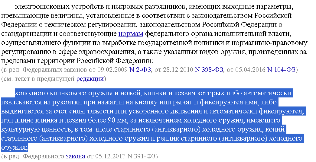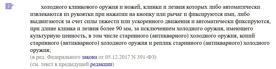 холодного клинкового оружия и ножей, клинки и лезвия которых либо автоматически извлекаются из рукоятки при нажатии на кнопку или рычаг и фиксируются ими, либо выдвигаются за счет силы тяжести или ускоренного движения и автоматически фиксируются, при длине клинка и лезвия более 90 мм, за исключением холодного оружия, имеющего культурную ценность, в том числе старинного (антикварного) холодного оружия, копий старинного (антикварного) холодного оружия и реплик старинного (антикварного) холодного оружия
