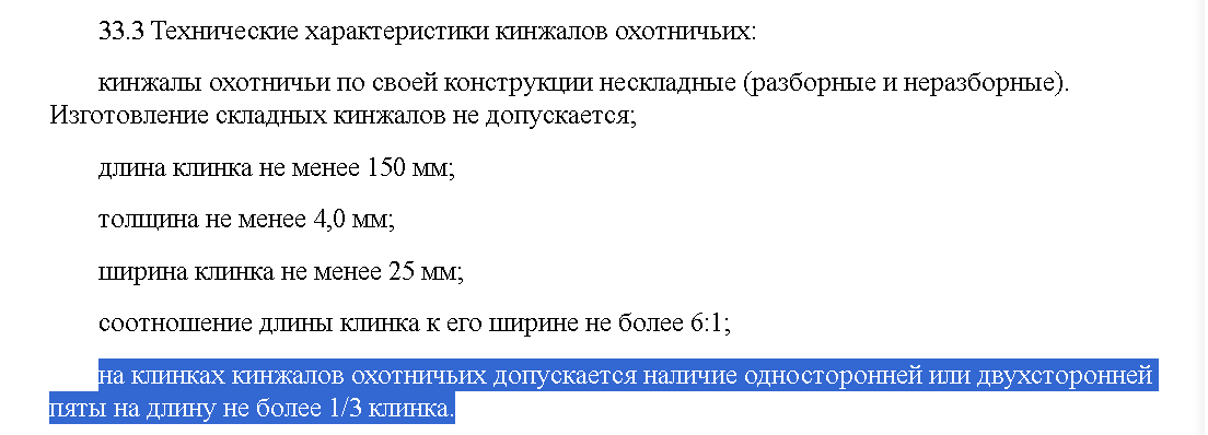 >>967681 Я не юрист, но знаю, что ментам на ГОСТ похуй, они пользуются соответствующим приказом МВД, я сюда кидал ссылку на актуальную редакцию, вроде бы она от 2018 года. Ссылка проебана, никто не сохранил скорее всего. В целом там то же самое, что и в ГОСТах. > Тут на скрине >>967617 про обоюдоострость ничего не написано. Про это отдельный пункт, я уже не помню, но вроде обоюдоострые разрешены только до 5см. Полуторные вроде никакие не запрещены, но вторая РК должна быть не более чем на 2/3 длины клина.