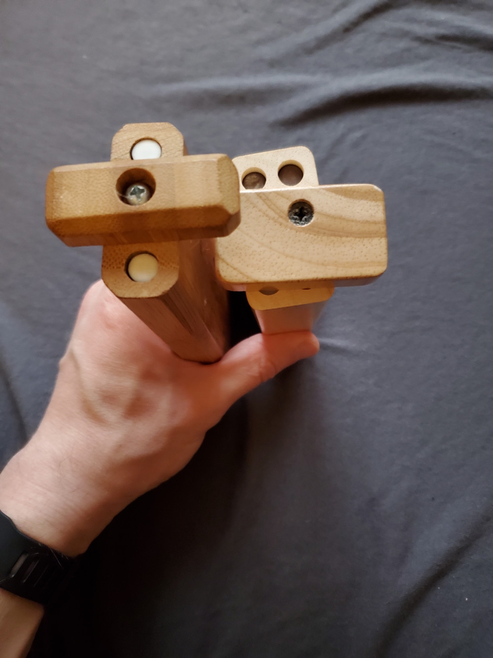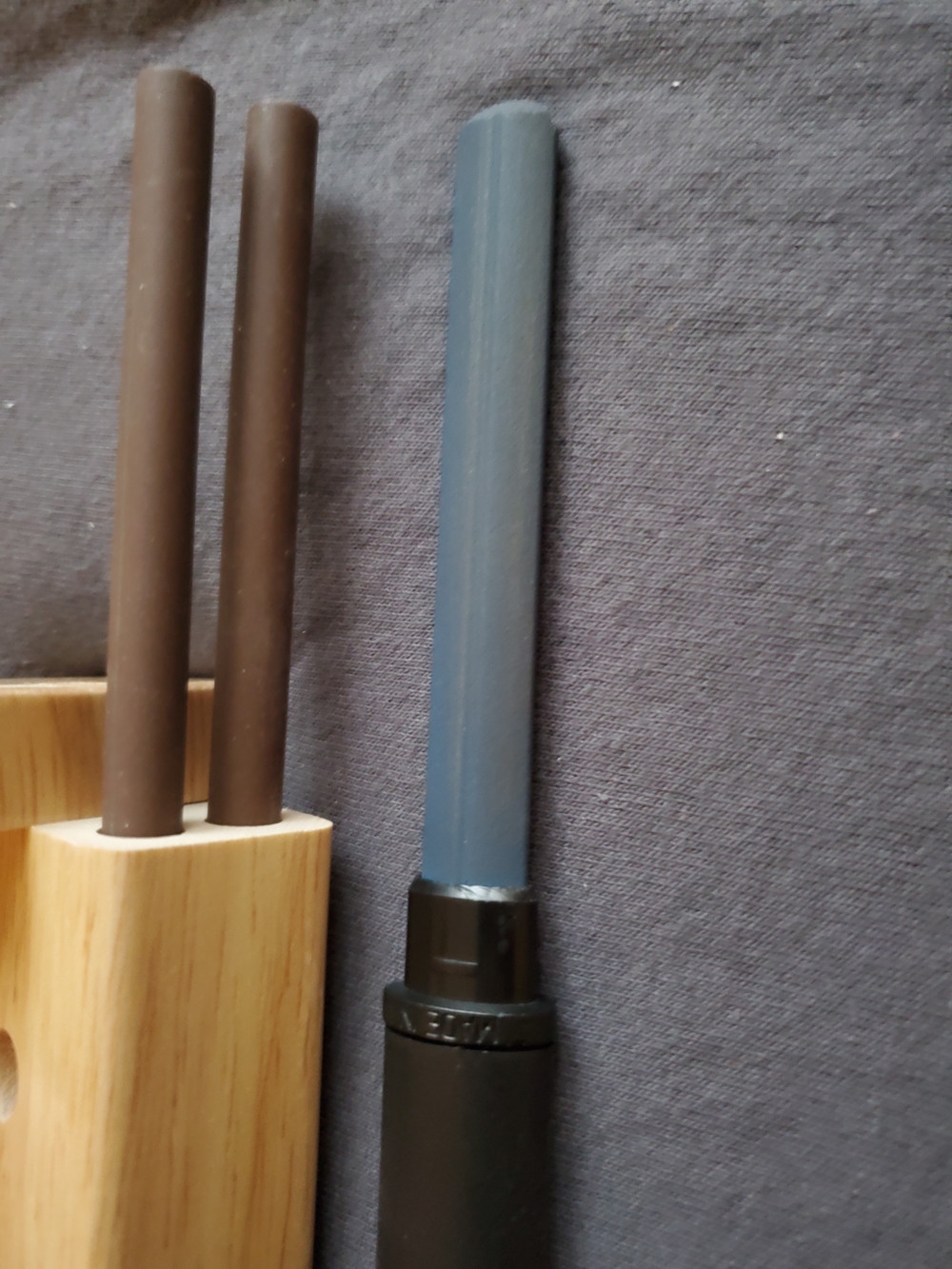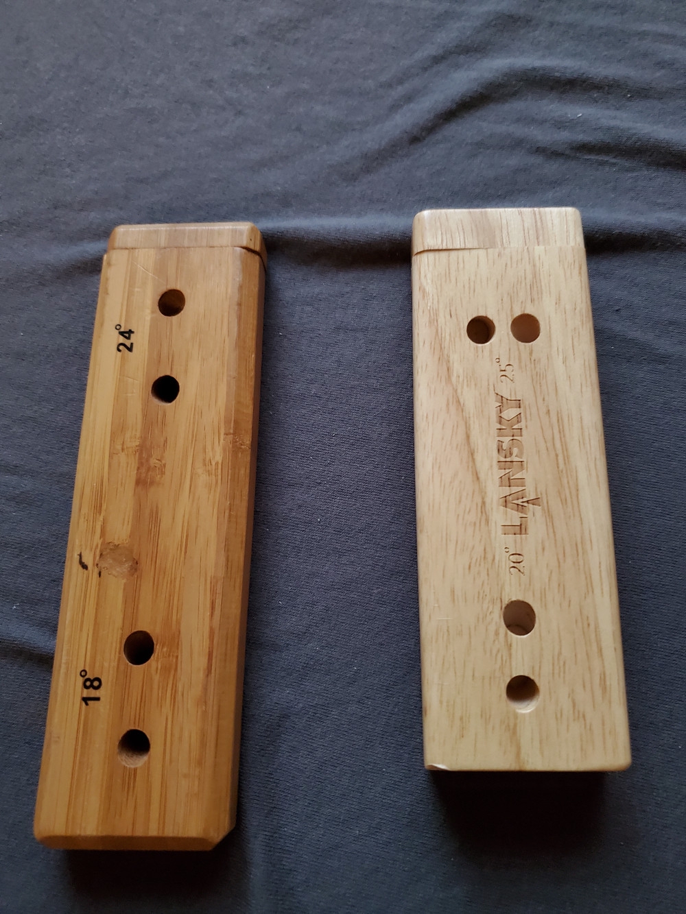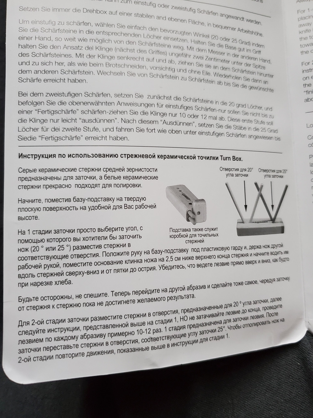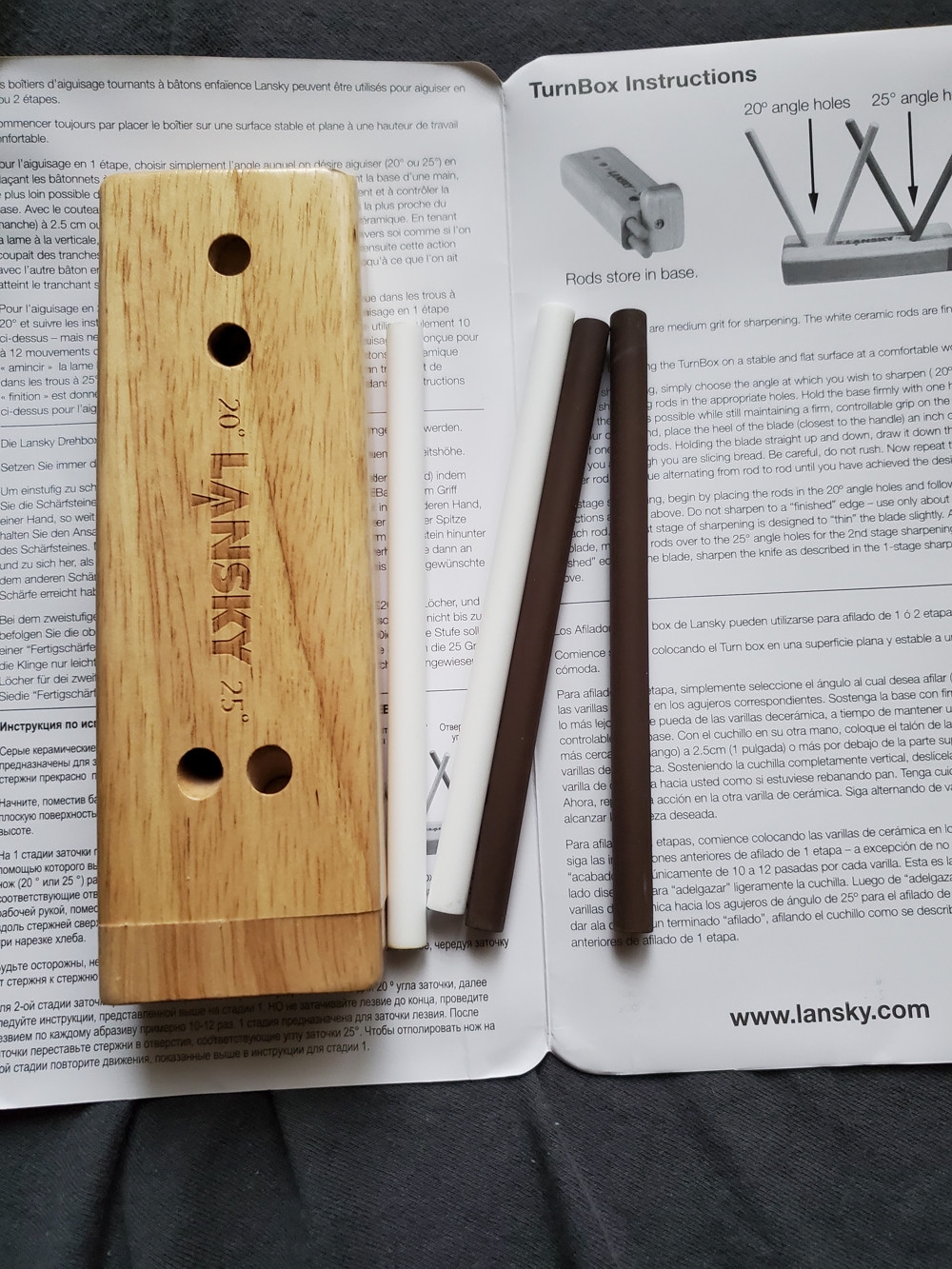 Пришел с ебэя lansky turnbox, и внезапно внутри есть инструкция на русском. Видать макулатуры напечатали на 10 лет вперед. Основа вырезана из бамбука, так же как китайский клон, и щедро залита акриловым лаком для бани. Китайский клон слегка спрыснут обычным лаком для дерева. Из отверстий внутри посыпалась остаточная деревянная труха после сверления. Белый стержень для правки однохуйственен китайцу. Коричневый стержень, более грубый, позиционируется в инструкции именно для заточки, но совет так себе. По грубости он уступает карманному мусату от виксов. Стержни в китайце сидят более плотно. В лански они слегка люфтят (хз, баг это или фича, в принципе можно выкрутиться сказав "а это чтоб вы при правке сильно клинком не давили"). Цена почти как у китайца. В принципе прикольная шняга для криворуких людей, которые не надрочились на весу выдерживать угол при правке.
