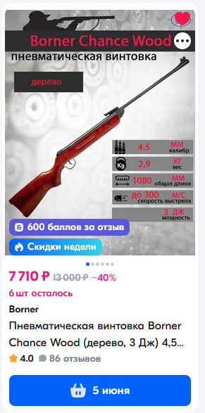 Таким образом, получаем повсеместную продажу пневматического оружия калибром от 5,5мм абсолютно непригодного к стрельбе мощностью 3дж, а также приспособлений (буквально в том же магазине) для приведения его к стрельбе мощностью свыше 7,5дж.