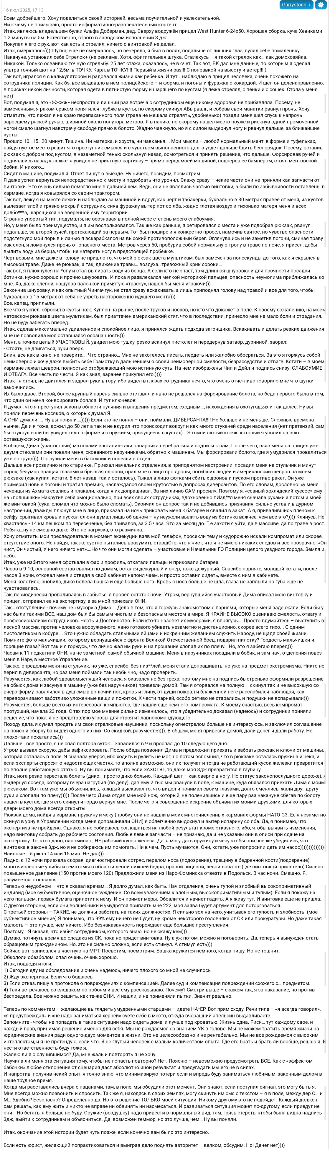 >>976805 >Пневмоебы обычно Вот тут навозражать имею. Пневмоёбы разные, не уподобляйся маням, которые делают выводы. Вот, например: >>976656 Кто тебе сказал, что это сделал не охотник с путёвкой, решивший похвастаться лосём вдоль своей новой игрушкой? Или егерь, отстреливающий заболевшее поголовье. Могло быть разное, даже если ты знаешь историю этого конкретного фото. >капелька давления Ну разве что капелька. Колят на тяжких, никто за воздушку на подвал не отправит, если "действия не содержат в себе состава иных преступлений". Человек, даже взрослый, никогда ранее не принимавшийся и "чего с ним будет происходить дальше" не знающий тебе и без капельки давления всё выложит, т.к. сам факт приёмки его уже деморализует максимально. >>976806 >Кто мы то? И тут ты ВНЕЗАНО осознаёшь, что общаешься не с семёном. Кек. >>976819 Сам его кормишь ну и я немножко >>976822 >до дома доеду, прокидаю ещё Так вот, продолжаю. Для начала следует выделить т.н. "кумулятивные статьи", которые как правило, образуются не по причине действий, в которых содержится состав этой статьи (тут необходимо исключить всякие контрольные закупки и прочие планы "ОРУЖИВО" которые как раз направлены на поиск конкретных жуликов путём КЗ или иных ОРМ) а по причине иных действий, когда жулик, совершая определённые действия, привлёк к себе достаточно внимания, чтобы выпотрошить содержимое своей комнатушки. Сотые, стодесятые и другие статьи, когда три гуся и всё что дальше пришили комплектом, ну ты понял. Эту хуйню можно дальше не рассматривать, жуликопроблемы идут нахуй вместе с жуликами. Вопрос знатокам: А при какой вообще ситуации без учёта описанного выше, может случиться ч.4 ст.223? Я предполагаю такие: 1. Банальный долбоебизм. Вася модернизировал свой дурострел и тащит его везде где можно в запрещённом состоянии. В какой-то момент его или гаишники стопают или рамку проходит на границе региона и у проверяющих появляется вопрос а следом за ним и вызов наряда для доставки в отдел - тут уже никто не даст ему ничего дёрнуть из дурострела и все его действия окажутся засняты либо нательной камерой гайца, либо камерами пункта пропуска, вокзала итд итп. Тут всё ясно, и это может объяснить часть приговоров без указания закупочных мероприятий. 2 Как писал выше, сычи, сносящие ворон в парке города, вблизи домов, на улицах, с балкона своей этажки - тут тоже всё ясно, с окна услышали пук дедом, вызвали наряд, доставили в отдел, собрали вместе содержимое карманов и сыч подписал. На этом всё и у меня варианты заканчиваются. Давайте подумаем вместе. >>976824 >Вот этот момент тоже очень интересный. Интереснее, чья подследственность ч.4 ст.223 по УПК. Или у меня ПОВЫЛАЗИЛО. >Привозят к экспертам воздушку и все что нашли вместе с ней. Тут вообще всё просто, на самом деле - эксперт отвечает исключительно на поставленные вопросы. То есть, если следствие/дознание ставит вопрос можно ли стрелять из дурострела, то эксперт однозначно отвечает - нельзя, так как при вытащенном а/б дурострел либо вообще не стреляет либо стреляет но не стволом. Воздух просто вылетает из места где был жиклёр перепуска, как у кралов, например. А вот если вопрос будет поставлен правильно - мог ли подозреваемый изменить дурострел так, чтобы производить выстрелы, но убрать из конструкции какую-нибудь деталь, например ту, что у него в рукоятке л2 лежит или на брелке штифт от клю