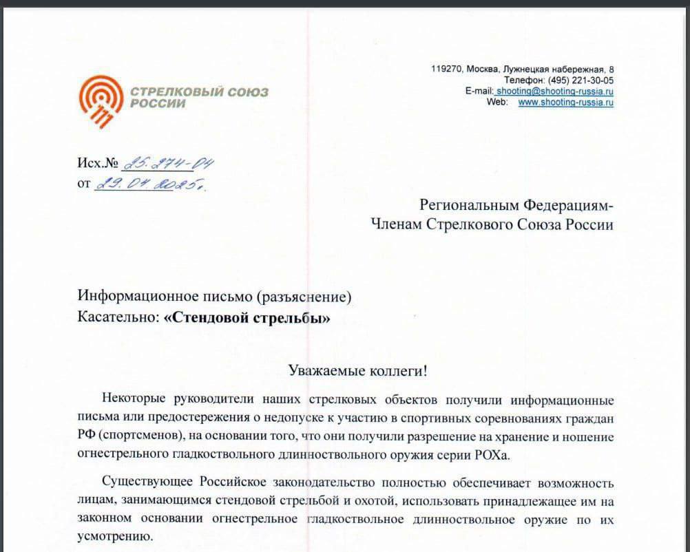Некоторые руководители наших стрелковых объектов получили информационные письма или предостережения о недопуске к участию в спортивных соревнованиях граждан РФ (спортсменов), на основании того, что они получили разрешение на хранение и ношение огнестрельного гладкоствольного длинноствольного оружия серии РОХа.