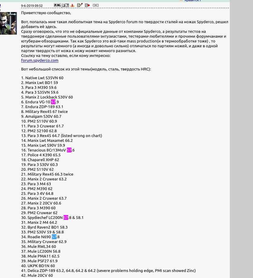 >>988482 > он-то им всего и делал, что рубил кости индейки мороженной на стеклянной тарелке, мешал картошку на чугунной сковородке, потрошил рыбу, вскрывал устриц, а потом с размаху бросал в посудомойку вместе с ложками и вилками. И что из этого не выдержит нож из 9хс или мехпилы? > А это всё, сынок, потому, что статистическое большинство ножей делается под параметры и потребности статистического большинства людей. А люди эти - что у нас, что в Америке, что в Китае - неискушённые обыватели, а очень часто и вовсе криворукие безмозглые долбоёбы. Да-да, все кругом быдлота и глубинарии, один ты аристократ духа. > Нет, конечно, есть и приличные конторы, которые делают ножи не для быдла, а для ценителей - там и твёрдость, и тонкость и ещё много всякого хорошего, но на общем фоне таких ножей очень мало. Например? На самом деле всё намного проще: - 58+- роквеллов это оптимальная твердость для любой стали, подходящей для ножа. - разница 2-3 роквелла для сталей, из которых можно сделать нож, это статистическая погрешность и никак не влияет ни на что. - сами стали, подходящие для ножей, между собой почти не отличаются, во всяком случае, отличий там в разы меньше, чем кукарекается маркетологами.