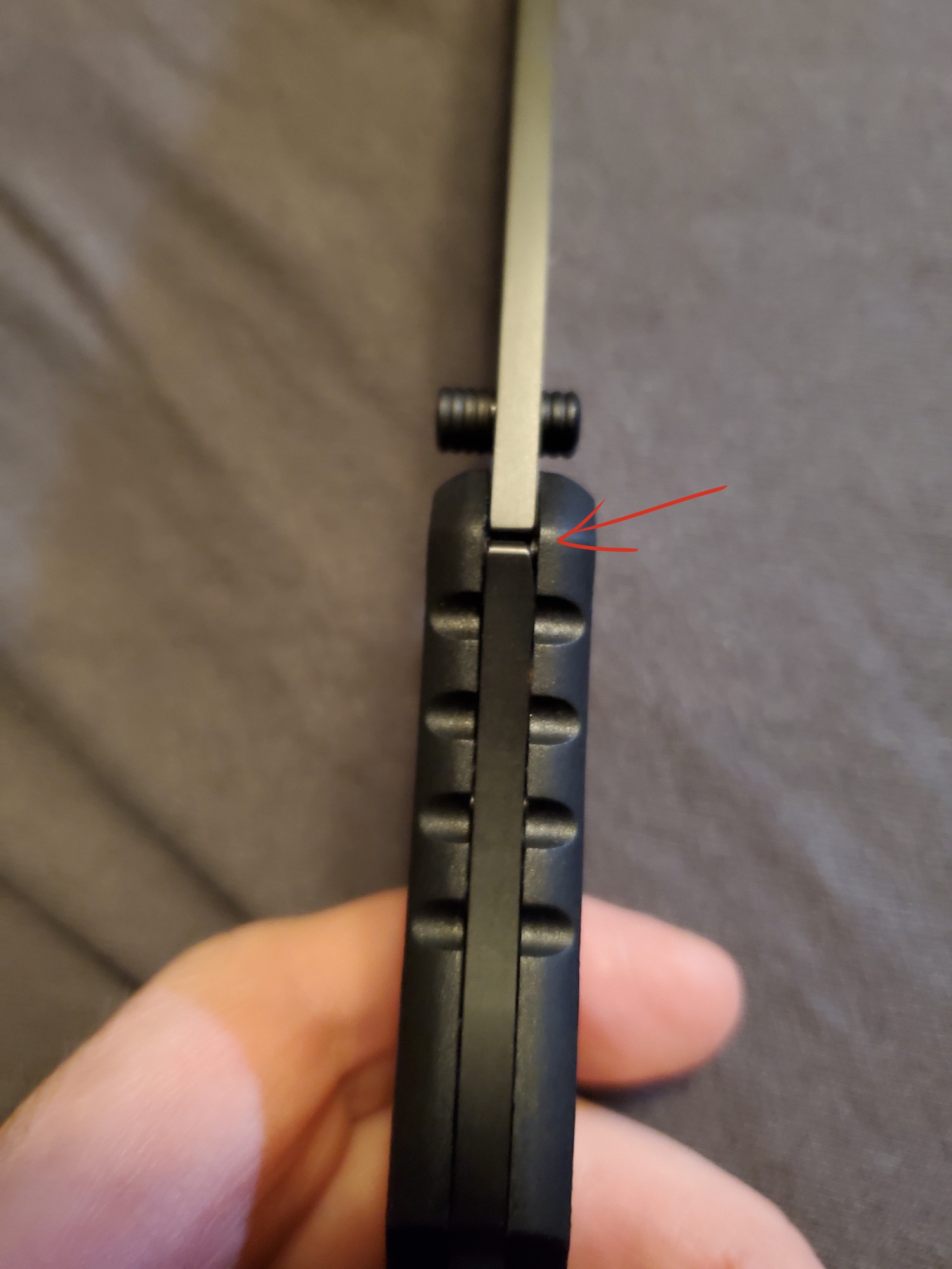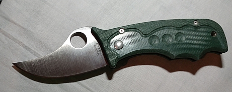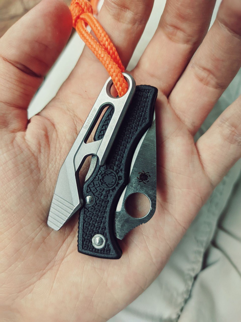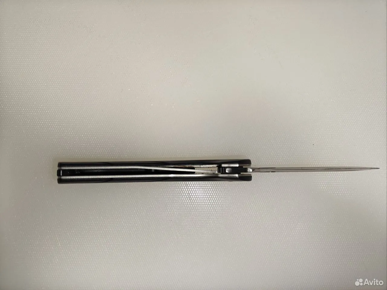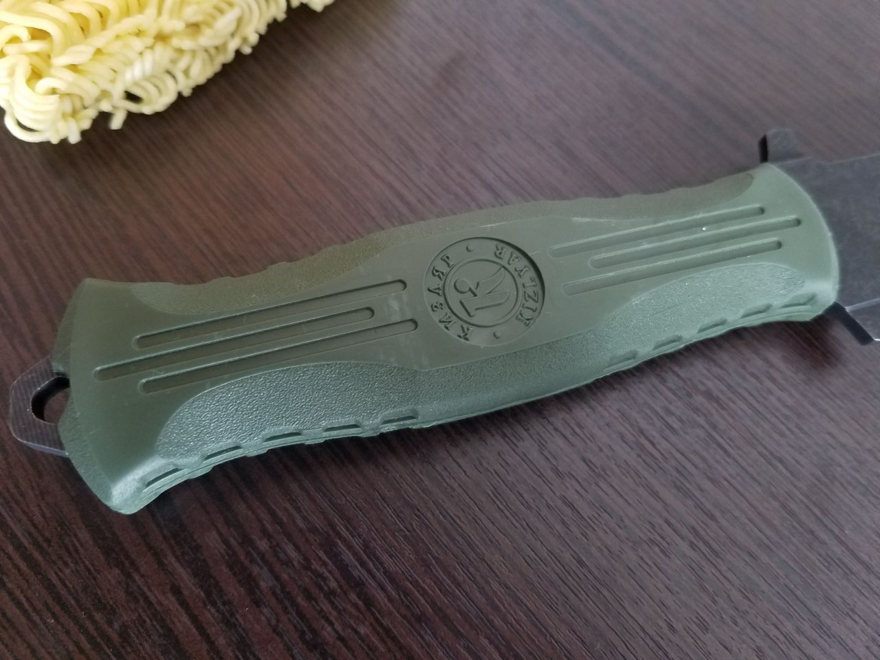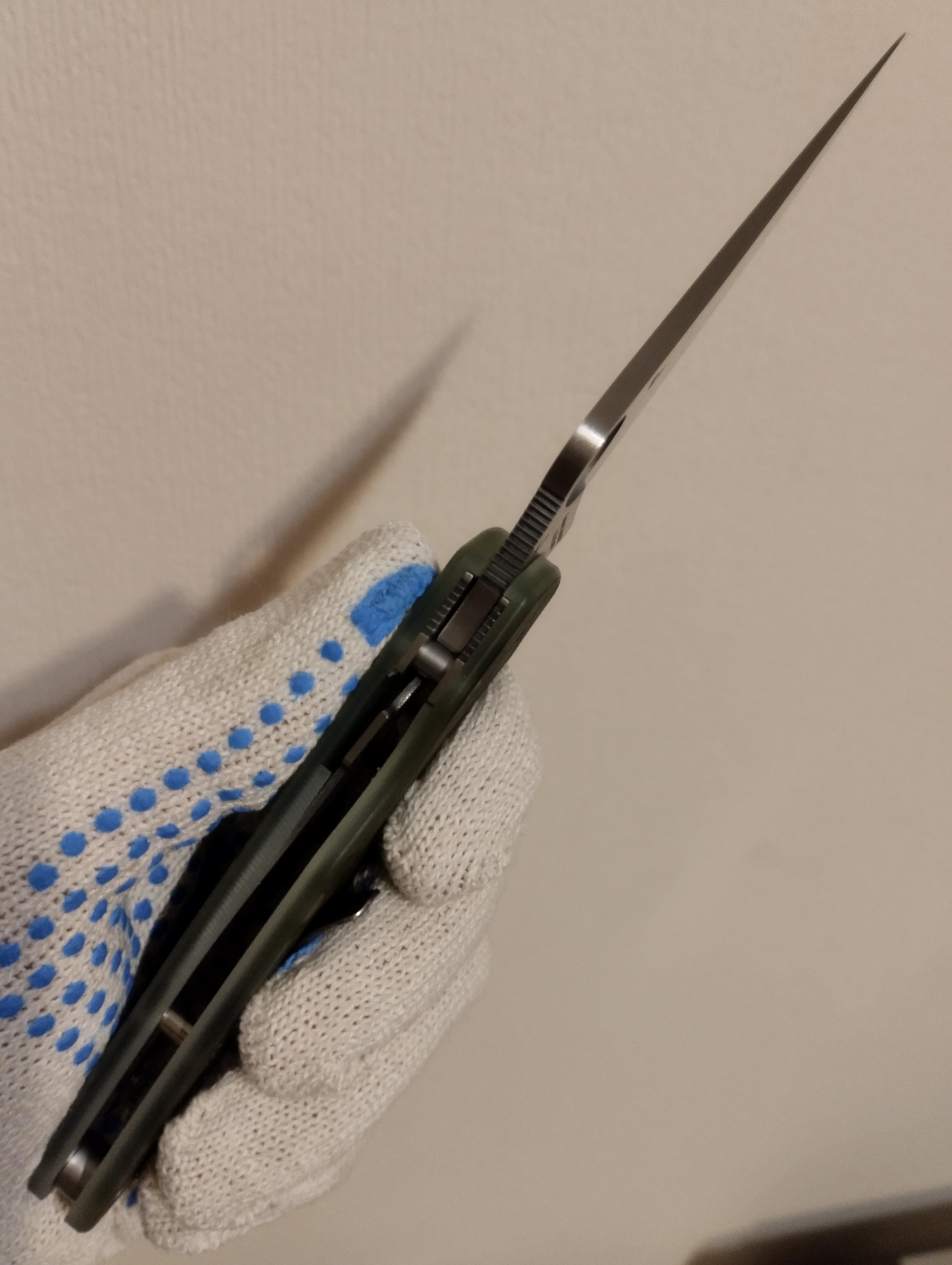 Теперь сравнение с китайским клоном. 1. Ячейки плетения g10 крупнее, но у китая более шершавое. 2. Внезапно клинки разной формы. У орига лезвие сужается к кончику, из-за чего: а) имеет более хищный вид; б) визуально выглядит меньше, из-за чего сам нож выглядит чуть меньше, и рукоять визуально доминирует по размеру; в) в теории будет лучше втыкаться. 3. Естественно разные шпеньки. 4. У орига все вырезы g10 более угловатые, у китая более округлые и плавные. 5. По механике у орига лучше выбрасывается клинок, чуть мягче ход. У китая видимо злее пружина, когда закрываешь, на середине закрытия она срабатывает и резко пытается оттяпать пальцы.
