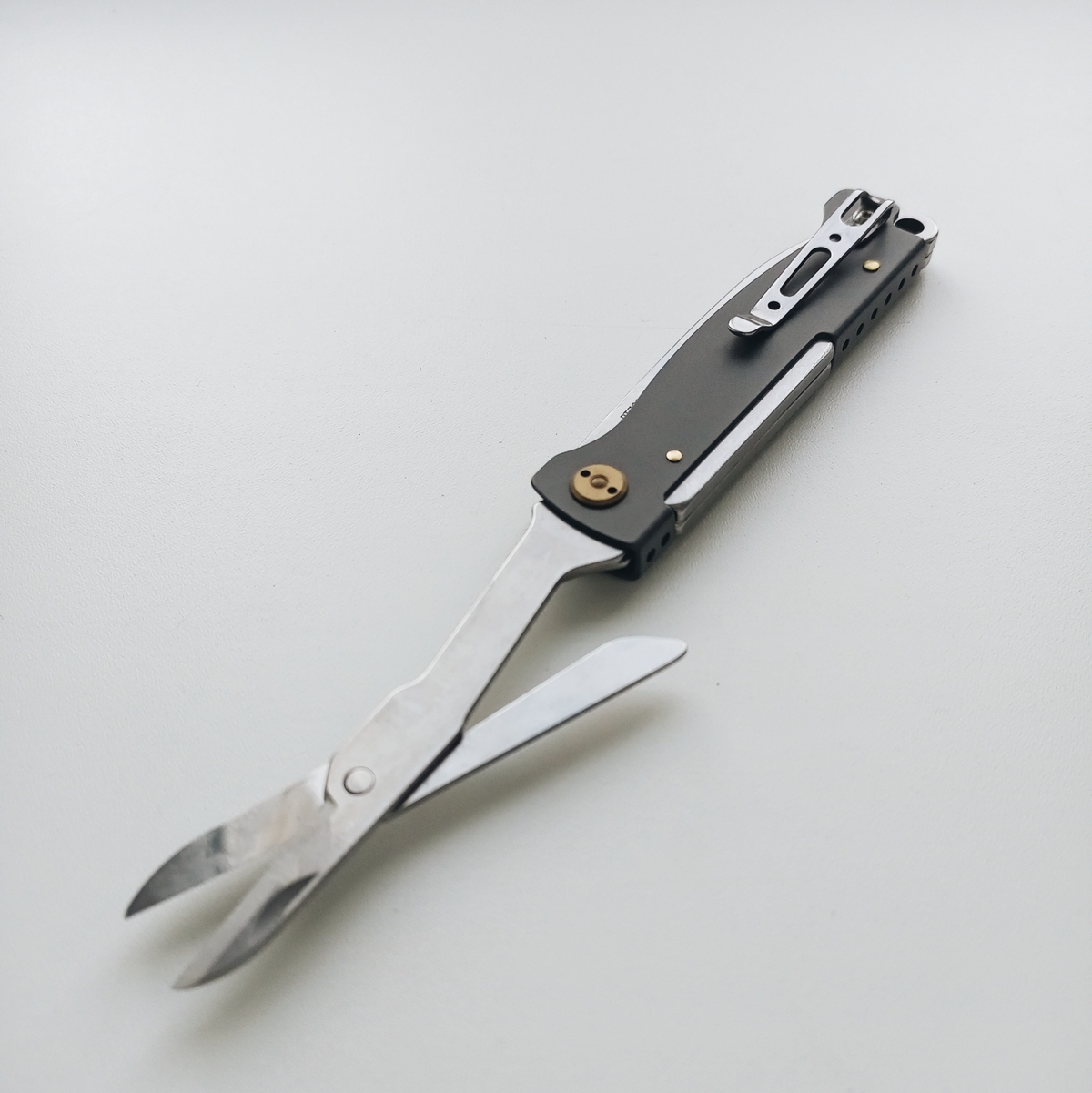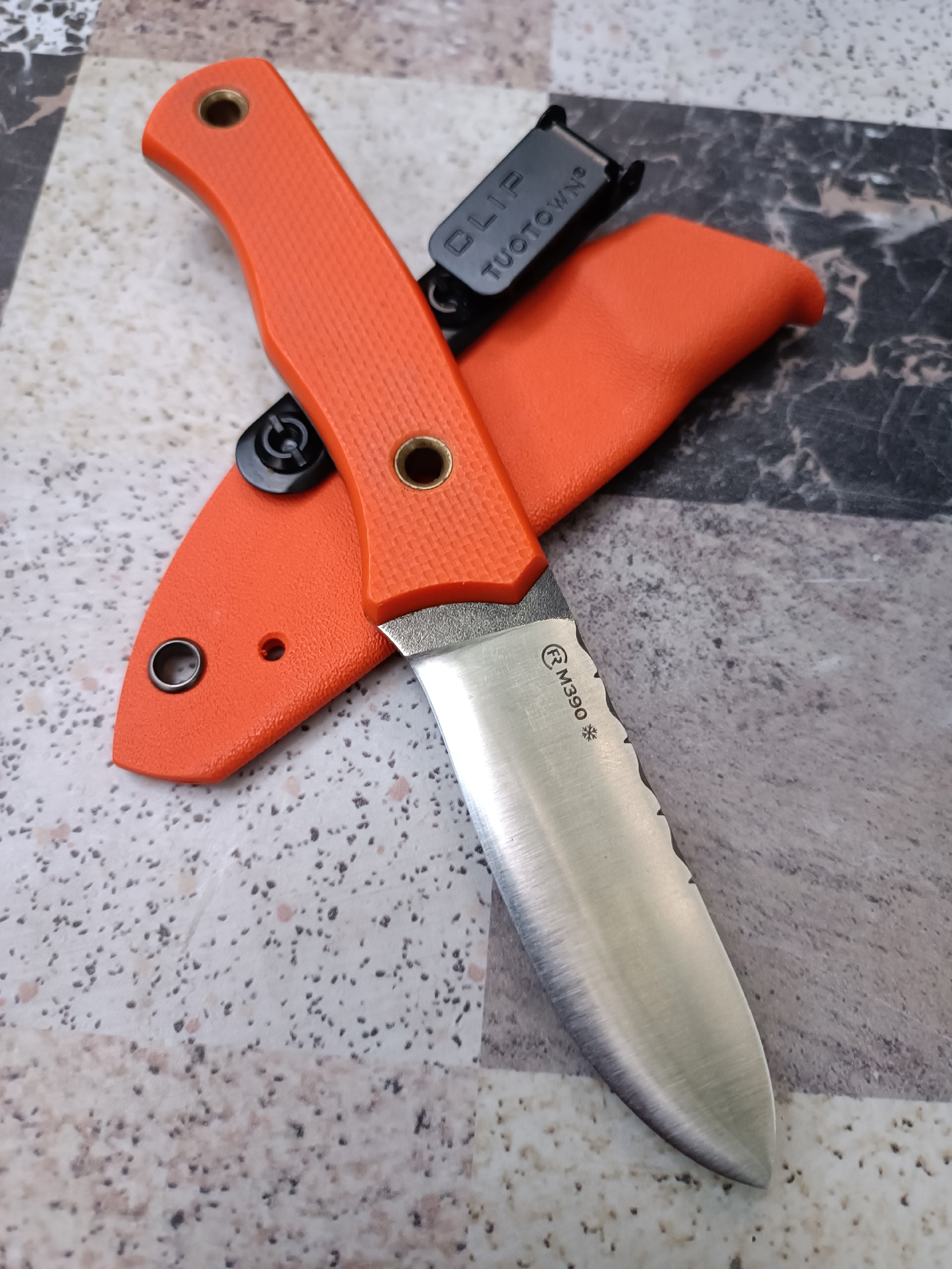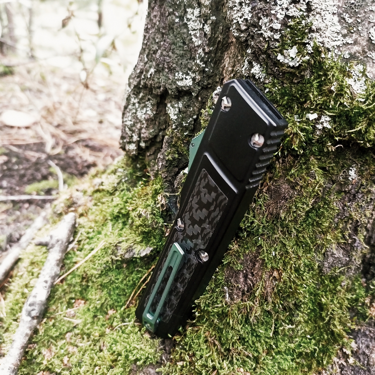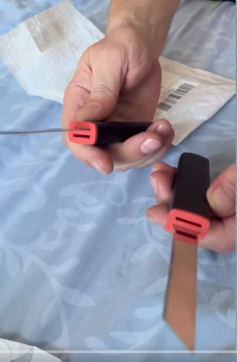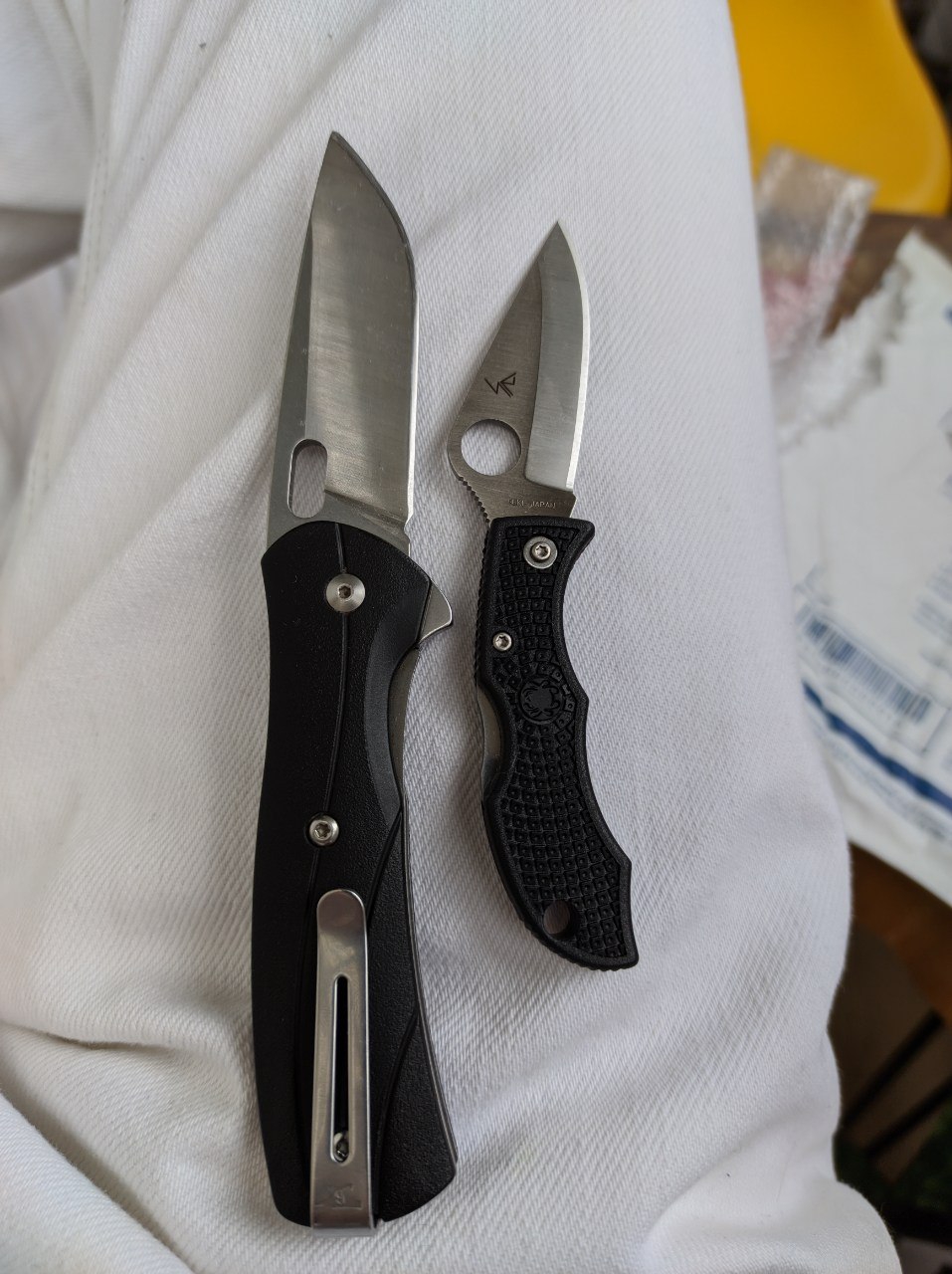 Теперь сравнение с китайским клоном. 1. Ячейки плетения g10 крупнее, но у китая более шершавое. 2. Внезапно клинки разной формы. У орига лезвие сужается к кончику, из-за чего: а) имеет более хищный вид; б) визуально выглядит меньше, из-за чего сам нож выглядит чуть меньше, и рукоять визуально доминирует по размеру; в) в теории будет лучше втыкаться. 3. Естественно разные шпеньки. 4. У орига все вырезы g10 более угловатые, у китая более округлые и плавные. 5. По механике у орига лучше выбрасывается клинок, чуть мягче ход. У китая видимо злее пружина, когда закрываешь, на середине закрытия она срабатывает и резко пытается оттяпать пальцы.