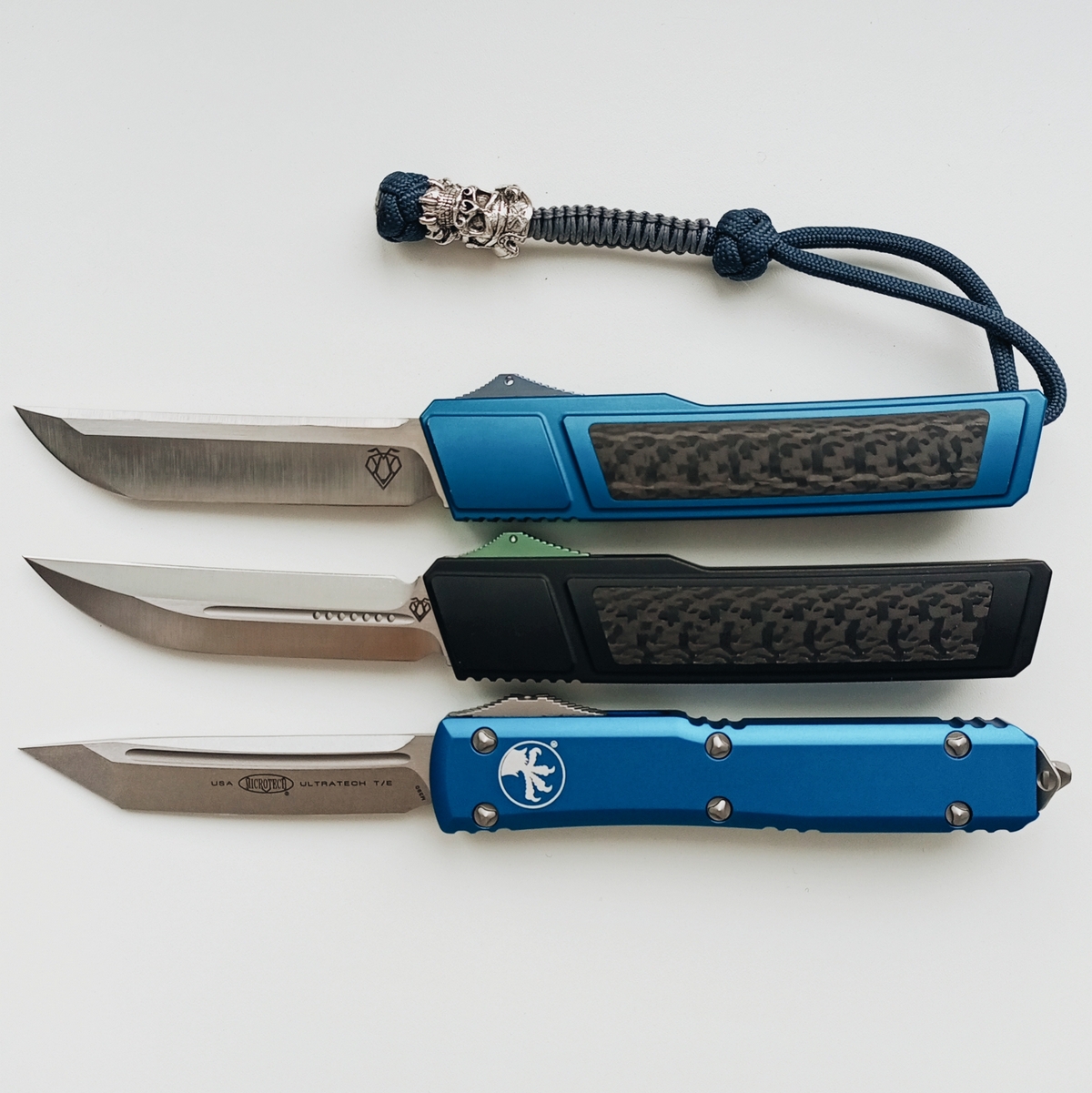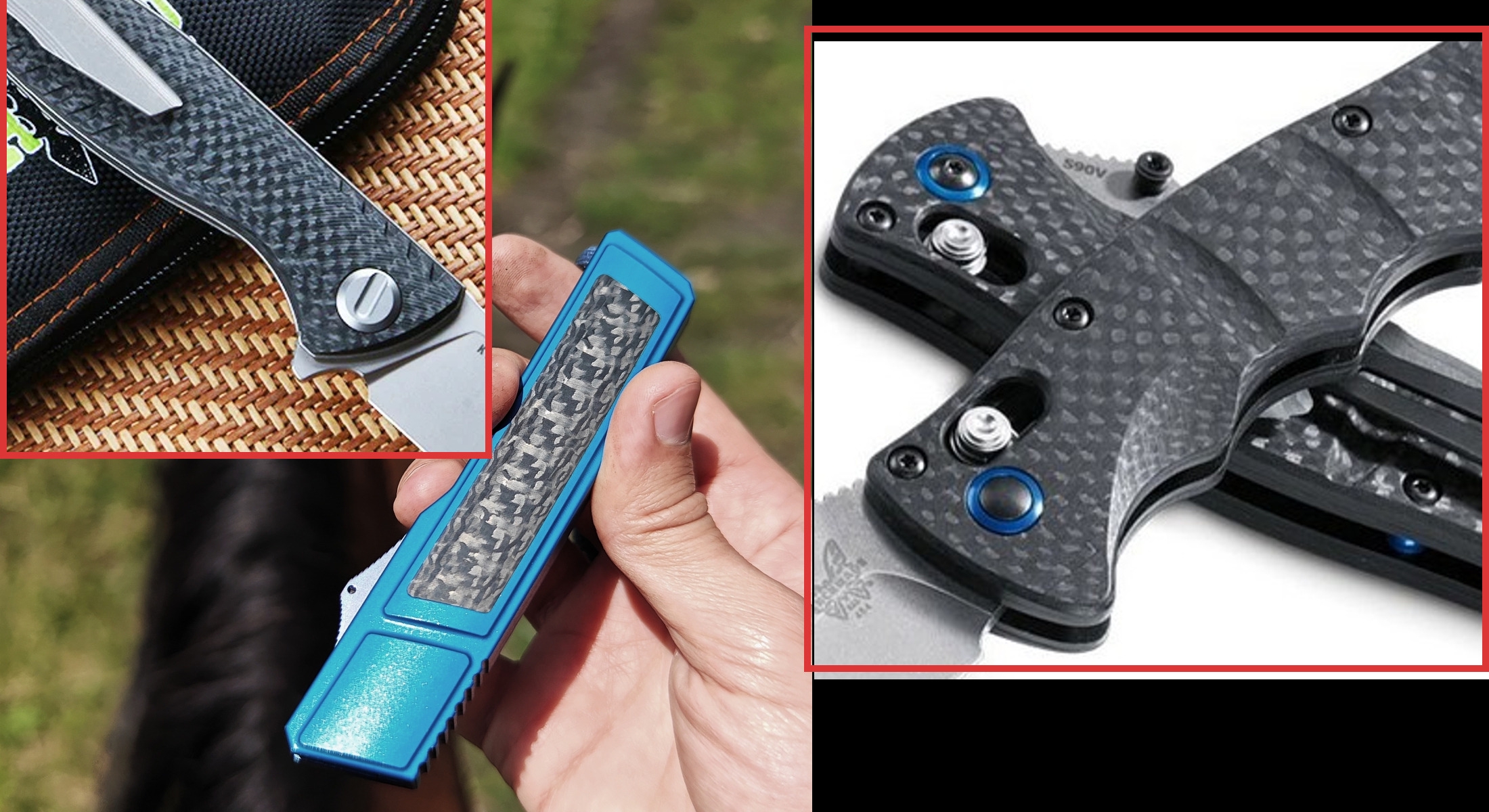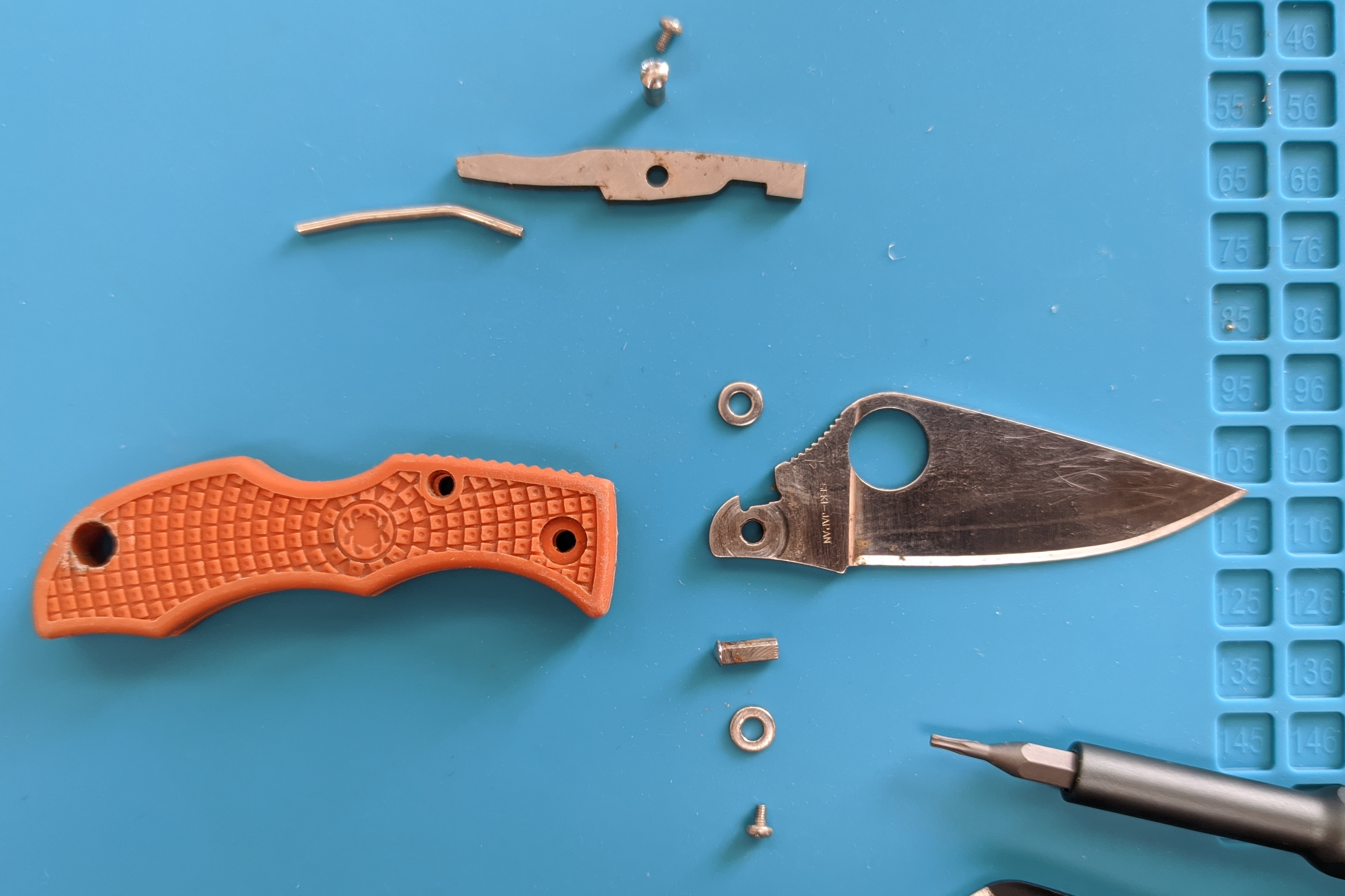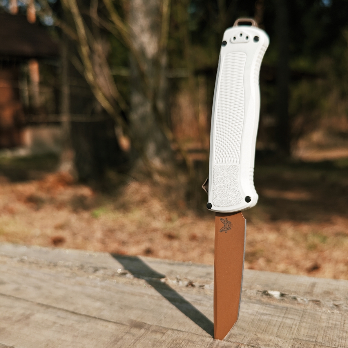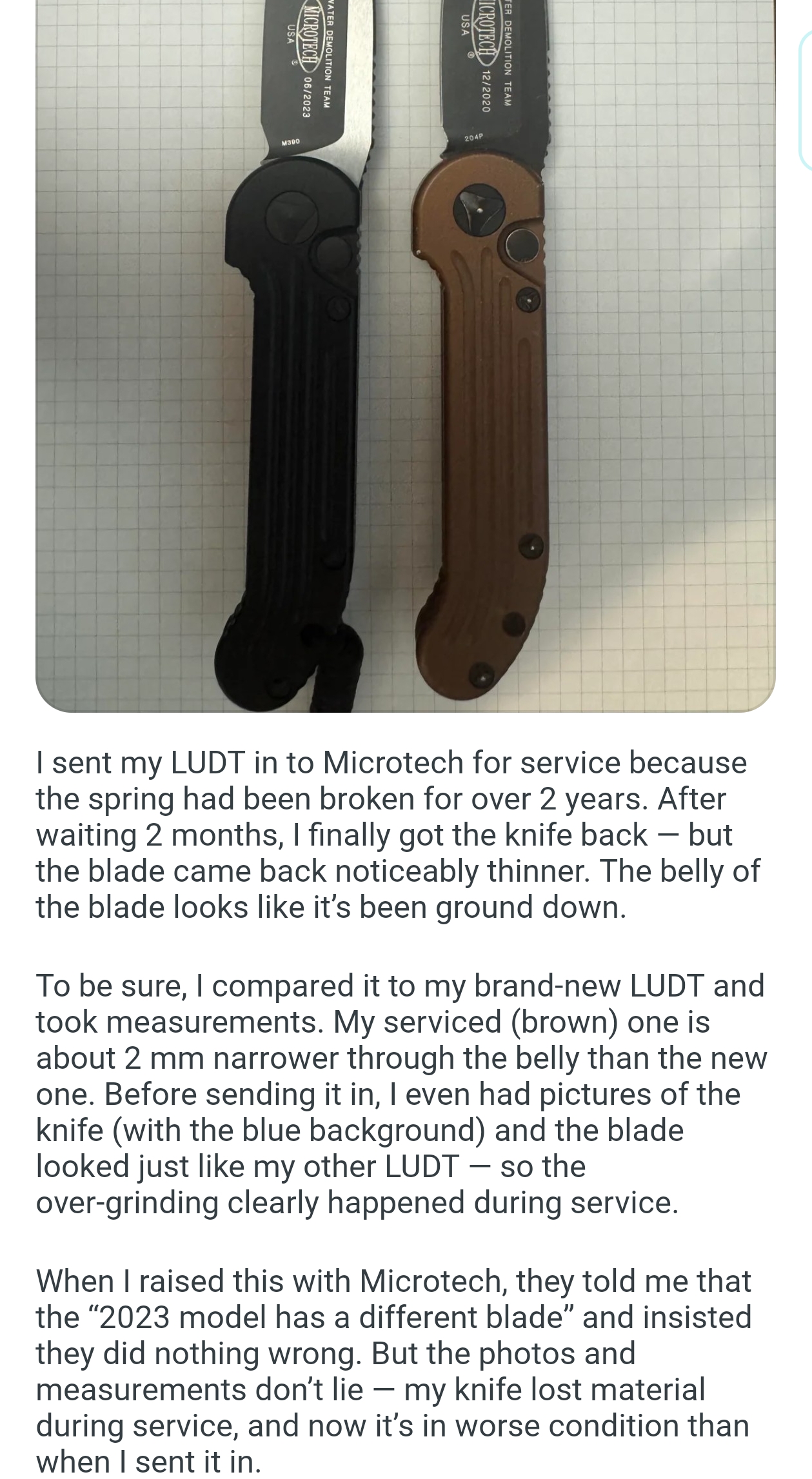 Теперь сравнение с китайским клоном. 1. Ячейки плетения g10 крупнее, но у китая более шершавое. 2. Внезапно клинки разной формы. У орига лезвие сужается к кончику, из-за чего: а) имеет более хищный вид; б) визуально выглядит меньше, из-за чего сам нож выглядит чуть меньше, и рукоять визуально доминирует по размеру; в) в теории будет лучше втыкаться. 3. Естественно разные шпеньки. 4. У орига все вырезы g10 более угловатые, у китая более округлые и плавные. 5. По механике у орига лучше выбрасывается клинок, чуть мягче ход. У китая видимо злее пружина, когда закрываешь, на середине закрытия она срабатывает и резко пытается оттяпать пальцы.
