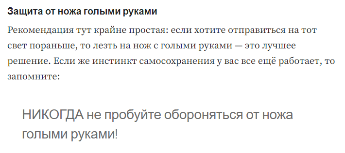 >>994067 >На руки принять. Самое реальное из советов против ножа- успеть обмотать руку курткой/пиджаком/подобной одеждой/рюкзак как щит использовать. Или хоть ремнём/чем получится отмахиваться, в глаза ножевику хлестать.