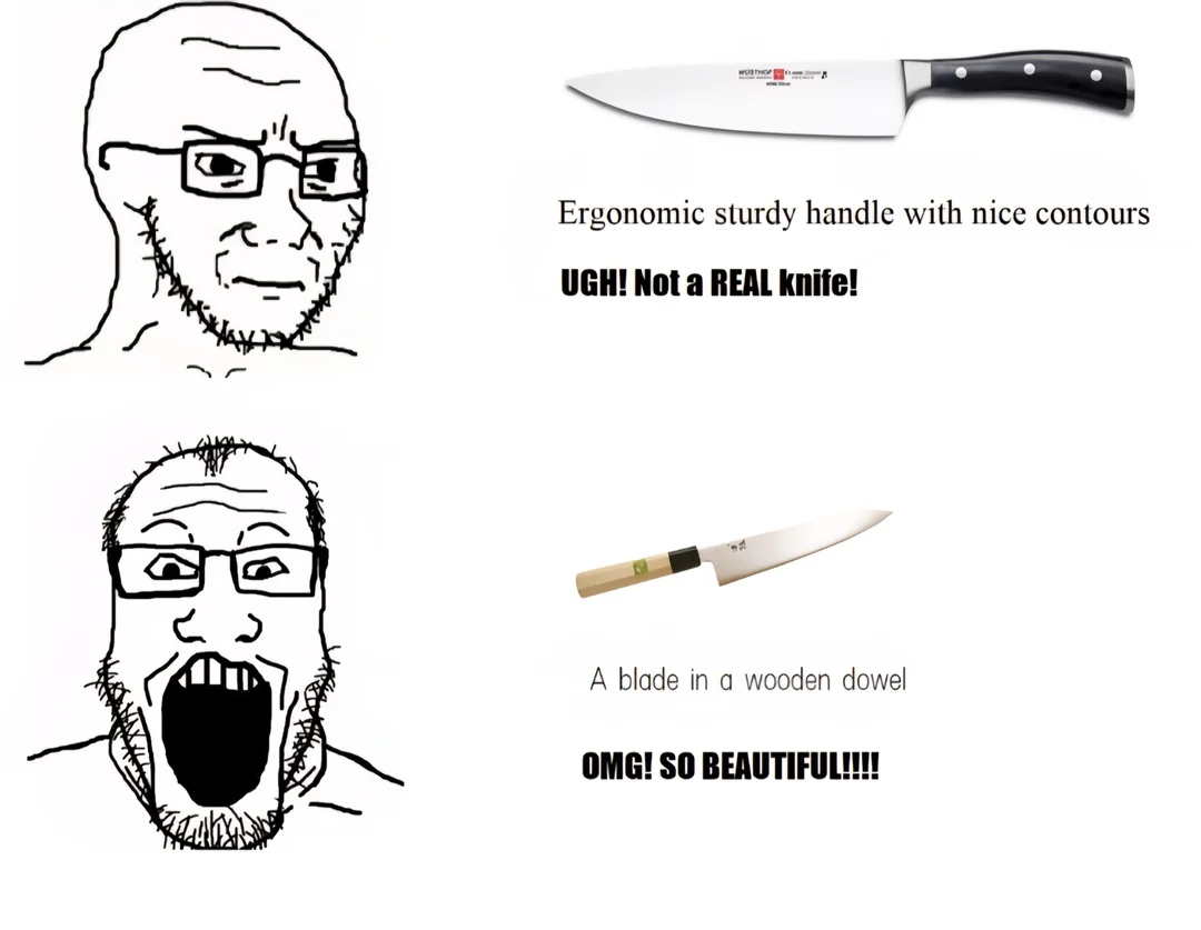 Кухонные ножи, которые в этом треде зачем-то обсуждаются - это какая-то отдельная секта. Лично мне (я не повар), абсолютно непонятно, зачем нужно большинство из них. Как бы очевидно, что на кухне нужен нож побольше, средний и поменьше, ну + овощечистка и открывашка (не для зумерков). Этого достаточно чтобы приготовить любую еду в пределах разумного. Нахуя все эти десятки разновидностей японских стамесок, китайских ножей с разными названиями, но по факту примерно одинаковых, вопрос открытый. Что вы всей этой хуетой готовите?..