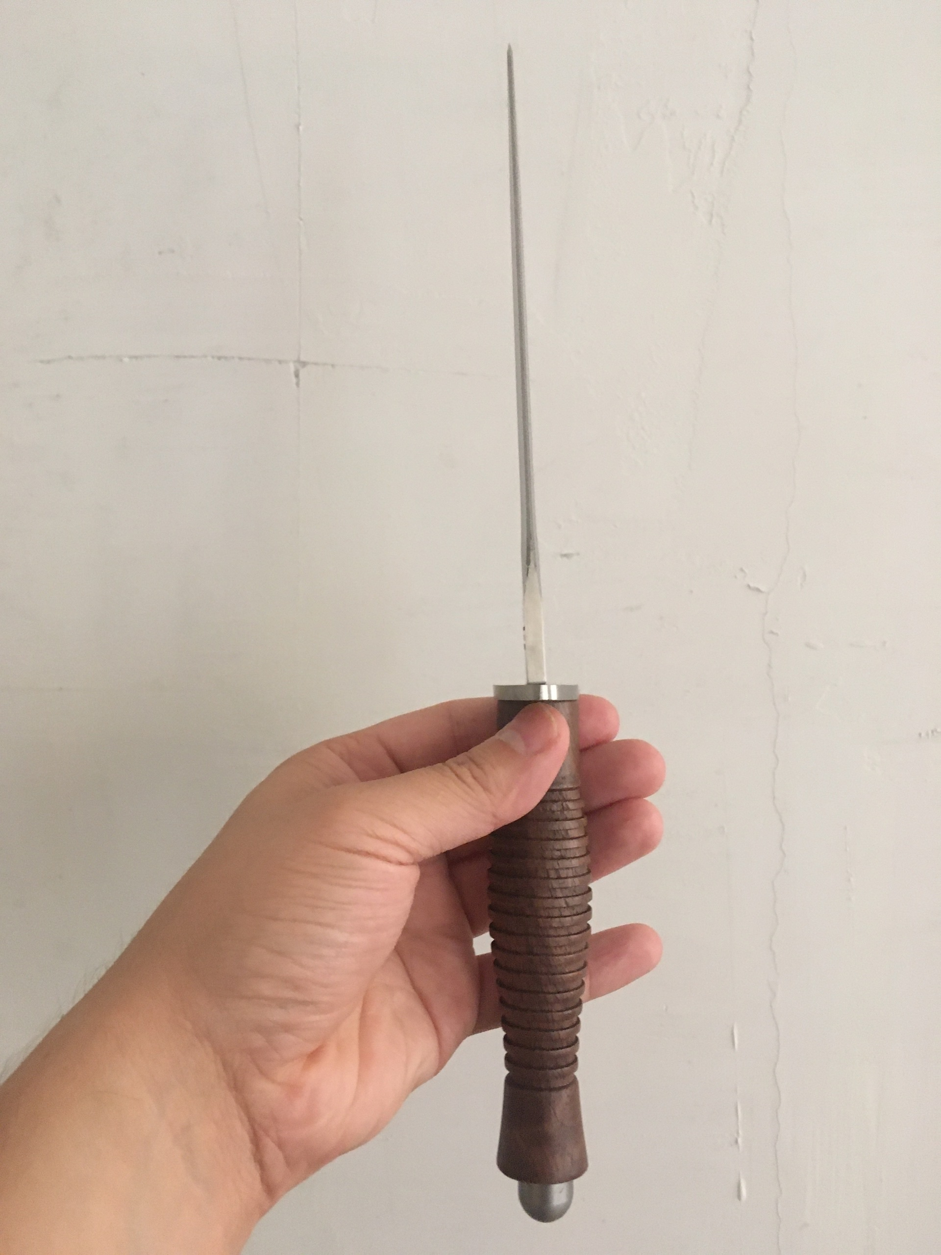 >>996798 Берёза. Год естественной сушки. Старался делать переход от толстой части к концу максимально плавным, насколько можно было не пожертвовав прочностью. Тычки были ну... Вот я беру кухонник свой который я точу регулярно и он входит в арбузы, ткань, картон с малым усилием, даже без удара. А деревяха так не входит, ей будто бы надо с разбегу со всей дури и тогда мб что то и получится. Но мамонтов... Как....?.....