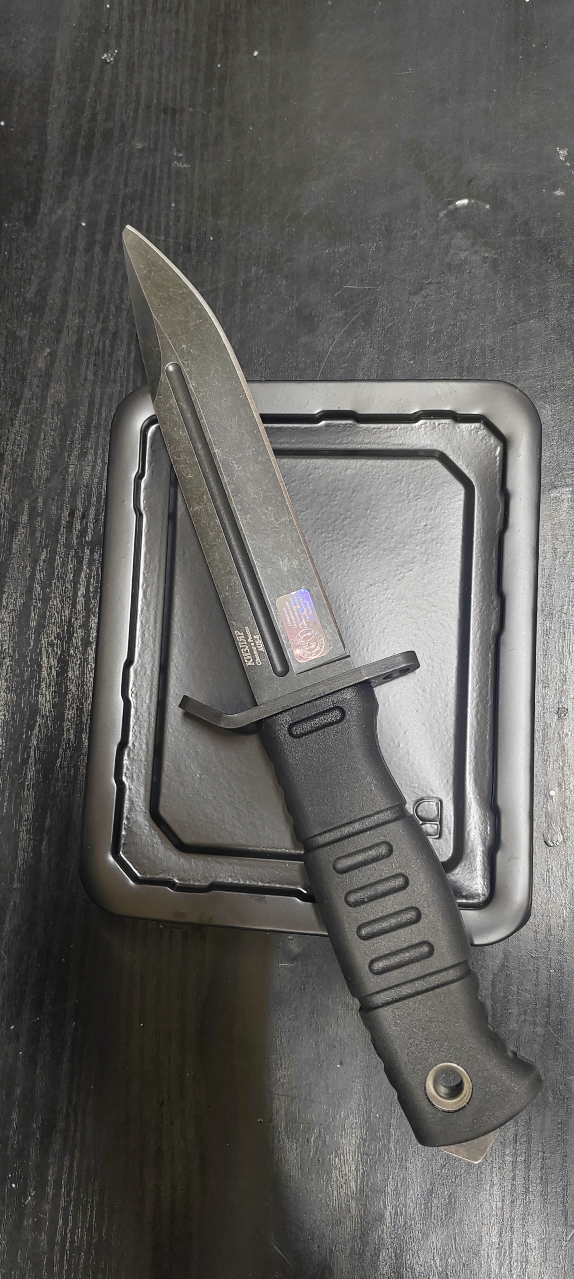 НР-18 нож всё-таки бюджетный, из того что мне не понравилось: Эластроновая ручка (на ощупь твёрдый ластик) пришла уже немного побитая, видимо будет биться дальше. 2. Текстура лезвия идёт полосочками. Изначально сильно бросалось в глаза, сейчас чуть меньше. 3. Ножны стукают края рукояти и за пару открытий уже есть следы. Вообще говорят что ножны неочень. 5. Сильновыпирающий "стеклобой" кринж, мешает ударом с ладонью на торце/навершии/пятке ножа.