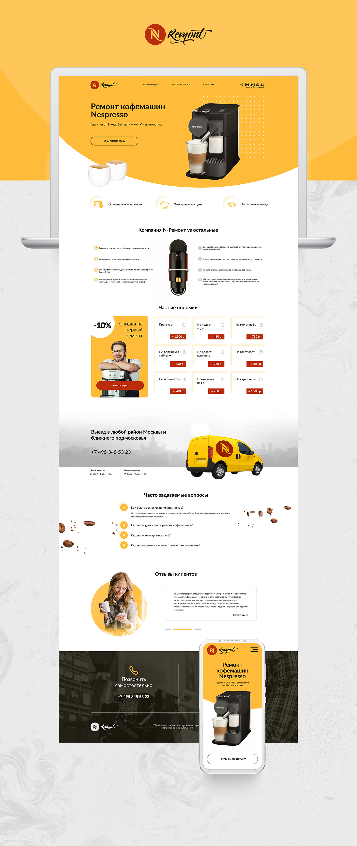 >>131769 1. слышал что-то вообще о семантических тегах? все на дивах, это ж пиздец, братишка. 2. нахуя хедер такой высокий на мобиле? меньше лого, иконку бургера больше. 3. бургер вообще не работает. 4. разные отступы между блоками, приводи в нормальный вид. 5. стена текста в "О нас" - ваще пиздец (можно добавить кнопку типа "узнать подробнее" и показывать весь текст) + тоже самое можно сделать с видео, нахуя челу скролить 100500 видосов? 6. в "Наши клиенты" на мобилке просится слайдер. да и не декстопе он просится, куда красивее будет смотреться 7. в форме добавь маски соответствующие. 8. не столь важно, но у svg соцсетей явно видима разница в размерах, для эстетики должны быть +- одинаковыми (инста меньше остальных) 9. зачем отдельный див под фон шапки? это можно сделать before/after