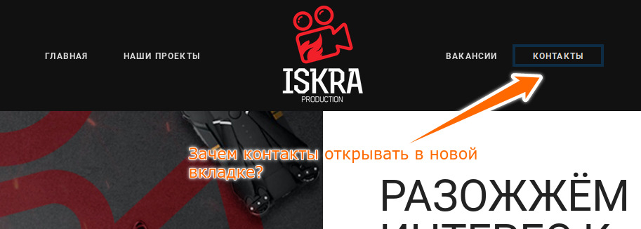 Ну и последнее, зачем контакты открывать в новой вкладке? Я когда кликнул по ссылке, подумал что меня перекинуло на другой сайт, потом сравнил URL, оказалось тот же. Короче это путает.