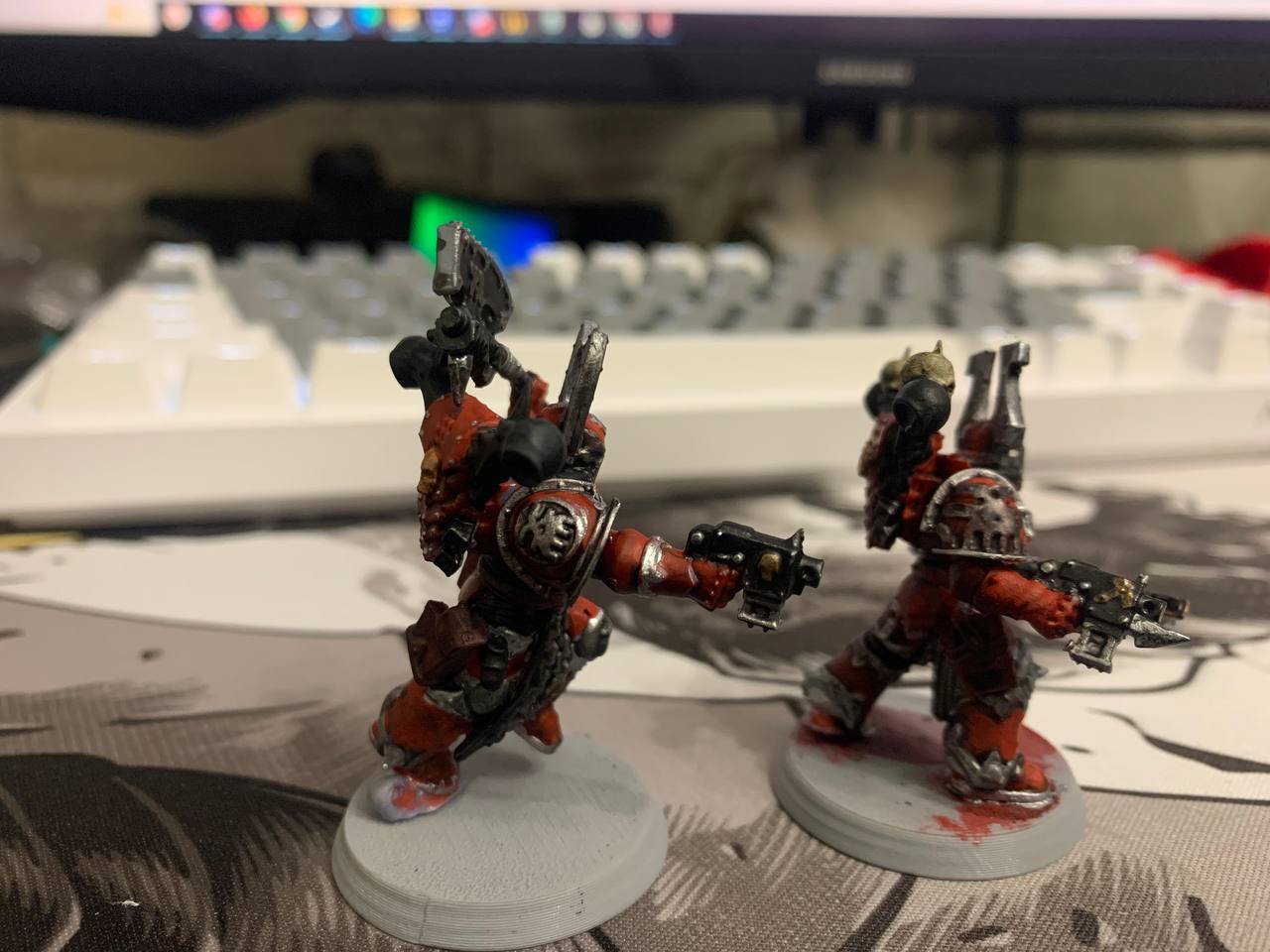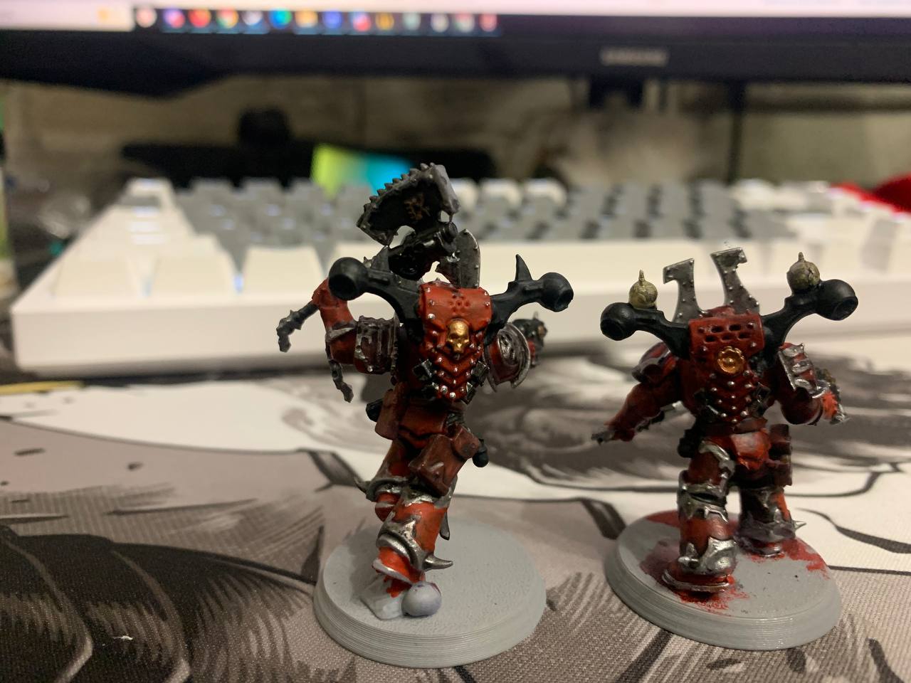 Сап покрасочный Оцените моих берсаков. Начал красить где то в сентябре. Это последняя работа. Попробовал кисти из войлока - хуита, буду дальше юзать синтетику. В этот раз чутка попробовал edge higlighting. Настолько чутка что даже не видно. Покраил красную броню - залили красной проливкой. Покрасил серебро - залил серебро чёрной проливкой. Делал я это для того что бы состарить броню и нанести на неё следы грязи с прошлых битв.