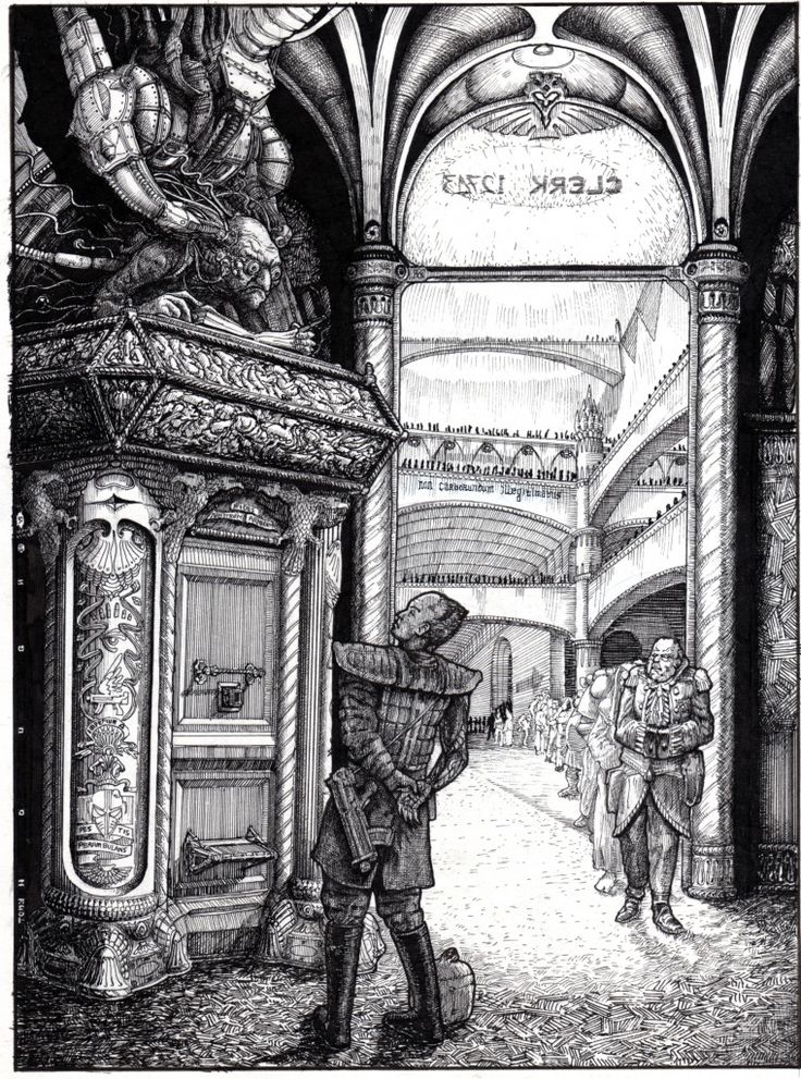 Обычный житель улья мало знаком с работой Адептус Администратум, поэтому его наиболее интересует третья функция базиликанума. Статуи, стоящие по бокам от основных входов, выдают почасовые акты и поденные прокламации – обычно пропаганду в виде «Мыслей благочестивого гражданина», но иногда и новости участка. Огромные толпы собираются, чтоб услышать выдаваемую по крохам мудрость.