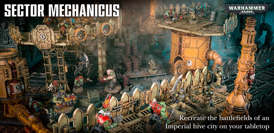 Запутанные индустриальные владения Адептус Механикус покрывают множество миров Империума. Сам воздух сотрясается от грохота тяжелых механизмов: кузниц и помп размером с район, созданных чтоб напитать огромную военную машину Империума. Как индустриальные центры, Секторы Механикус включают в себя всевозможные мануфакторумы, кузни, литейные, очистительные заводы, компакторы, репликаторы, реакторы и прочее. Многие из этих лязгающих сооружений являют тайну даже для преданно обслуживающих их жрецов. Некоторые машины возвышаются на мили, испещренные ржавыми порталами, дающими доступ армиям сервиторов и низших техноадептов. Инфраструктура Сектора Механикус более тяжеловесна, чем любых других зон улья. Бесконечные артерии энергетических каналов, прометиепроводов и труб, несущих алхимические микстуры, соединены в лабиринт. Целые поля дымовых труб и гальванических магнавентиляций выделяют такое ужасающее количество выбросов, что воздух густой и черный. Разнообразные машины и оборудование разбросано по территории Сектора Механикус, включая сервохаулеры, индустриальные маглев линии, термические плазмарегуляторы, серволифтери и маглифты.