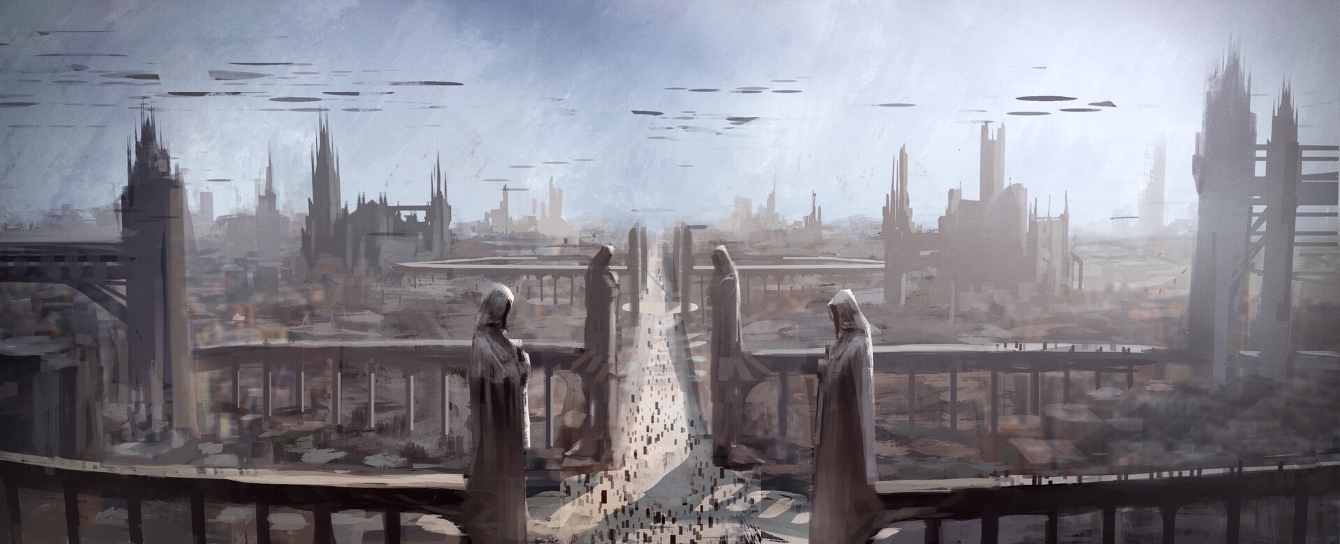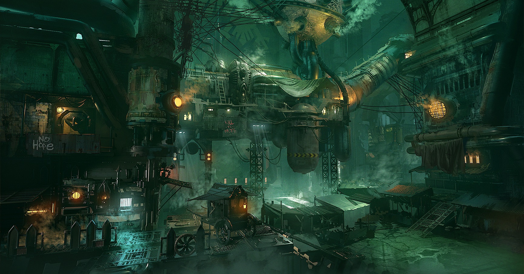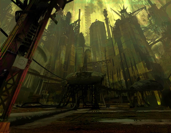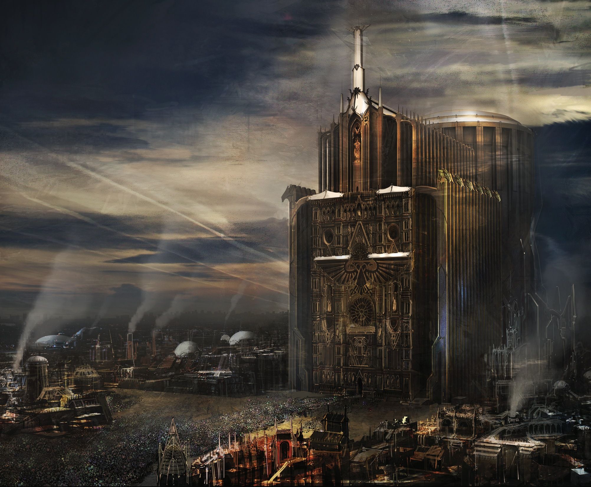 Ну если следовать духу бэка, то это должен быть город мегахрущовок, переходящих в шпили, и заводов, всё отделанное под готические соборы. Люди где побогаче живут в собственных апартаментах 15м2, где победнее живут как таджики помногу на нарах. Заводы из англии начала 19 века, транспорт исключительно общественный, личный транспорт -большая роскошь.