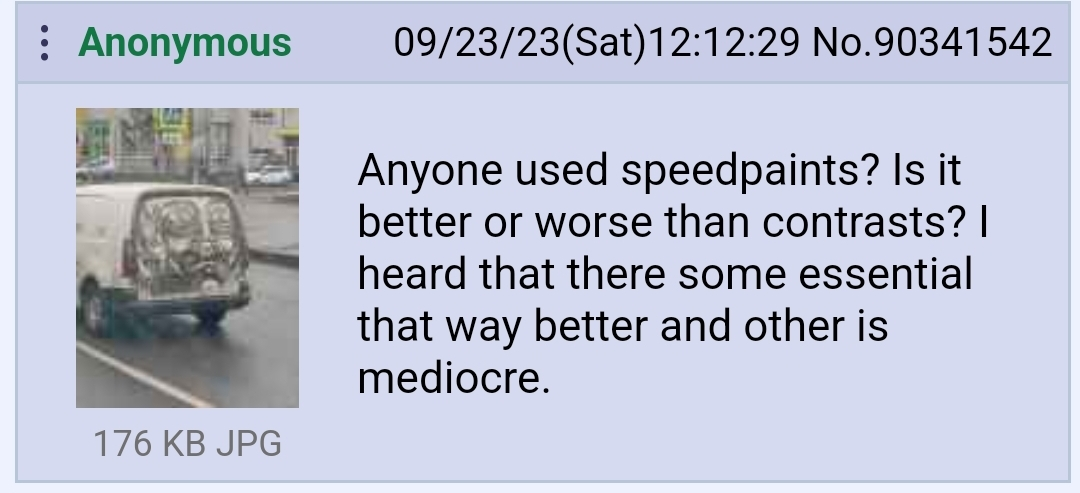 >>1064997 >стоит ли начинать Чел, вот серьезно, ты пришел в тред в котором сидят люди которые любят покрас, если отбросить троллинг то ответ тут будет только один. >можно ли добиться хорошего результата используя только кисточки и краску? Да можно, аэр, контрасты, все эти проливки-хуивки только упрощают/ускоряют процесс, но при желании и должных навыках все можно сделать и кистью. Важно только понимать что все это будет не сразу разве что ты не реинкарнация Канаева и навыки придут со временем.