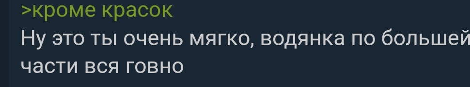 >>1084005 >Профи на ютубах Кто же они? Расскажи о них? Они сейчас с нами в этой комнате? Почему за дохуя лет покраса я ни разу не видел на трубе чтоб в гайдах рекомендовали худ акрил потому что это скрытый вин и разницы ноль? ||То что такие мастера есть я не сомневаюсь, в целом ты прав в том что профи скорее всего справится с любой краской. Но подозреваю что на ютубе такое будут проталкивать только чтоб выделиться и просмотров нафармить побольше|| >Новичку нужно красить красками для аэрографа Ну это вообще кек, ты их вообще в глаза видел? Если подходить с точки зрения криворукого нубаса то водой красить выйдет ещё сложнее.