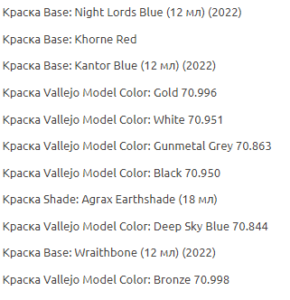 1. Черный: Abaddon Black 2. Синий: Kantor Blue или Caledor Sky 3. Металлический: Leadbelcher 4. Красный: Mephiston Red или Evil Sunz Scarlet 5. Белый: White Scar
