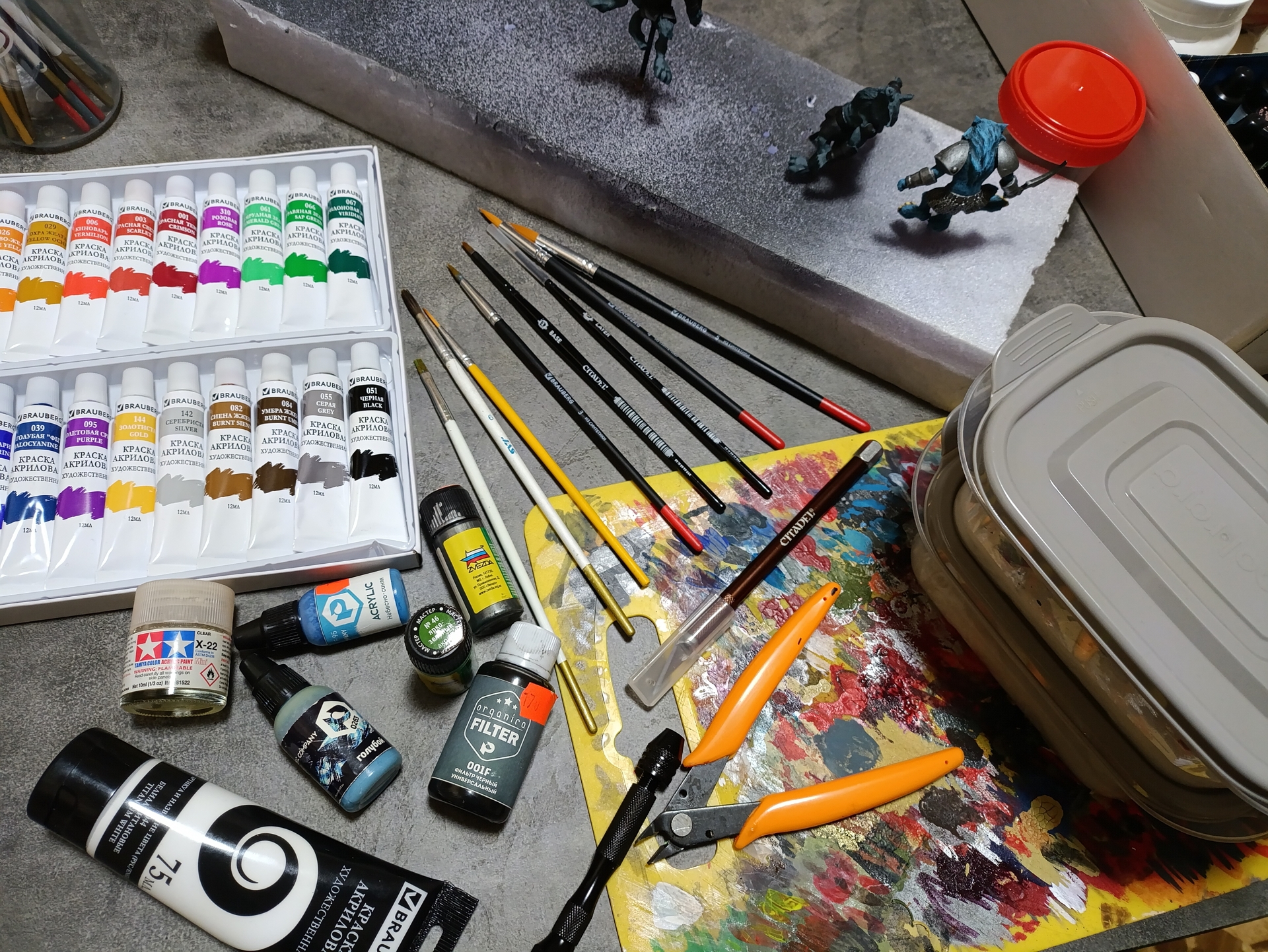 Художественные акрилы это не про покрас минек кистями. Они не укрывисты, пигмент более крупный, они как бы более тусклые что-ли. Но ими норм дуть (не кисть, а именно аэр) террейн. Дёшево и норм. Модельным акрилом только финишировать, и экономия сразу в тысячи рублей, если взять, к примеру, покрас полного комплекта террейна из киллтим ITD. Я для него брал акрил брауберг 12 цветов за 400р, израсходовал только 4 цвета по полтюбика, а если бы красил цитаделью, ну на тыщи полторы бы точно краски извел бы. Отдельной темой стоит белый, титановые. Например тех же Пасфайндеров я задувал мастер классом титаном, это очень чистый и действительно белый цвет. Но ещё раз - только аэр, художественный акрил под кисть не стоит на миниатюрах.