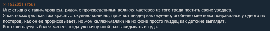 >>1089770 >Меня покрас успокаивает, отвлекает и поэтому я им занялся, даже если получается херово. Главное что удовольствие получаешь от этого. Первые блины всегда комом, опыта наберёшься и будет выходить збс.