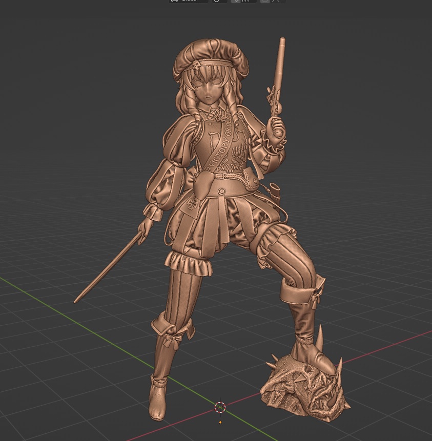 есть нюансы: 1) портки шапка и левая рука имеют много мелких складок на тряпках которые мешают хорошо на печатном столе расположить деталь. напечатать можно, но обрабатывать тонны суппортов будет потом неудобна. 2) пистоль и ладонь две разных части, я думал удобнее красить так будет. технически рукоять вставляется в ладонь, я поэтому печатал по отдельности. практически я нахуй разломал все пальцы на руке и содрал всю детализацию с щёчек рукояти ствола пытаясь пистолет ей в ладонь запихать, печатай всё вместе одной деталью. да неудобно подлезать кистью будет, но хоть ничего разъёбывать не придётся. 3) я конкретно хуёво слепил шевелюру сзади. текстуру вьющихся волос кистью накарябав можно вытащить хоть какой-то вид, но если по японской школе красить всё в монотон закатывая будет как откровенный кал говна смотреться. 4) шея с трудом со скрипом встаёт на своё место в ворот рубахи. паз уходит глубоко, поэтому перед я стачивал края шеи шоб нормально вставало 5) печатай тесак по возможности из прочной смолы. мне было впадлу менять смолу и я всё из своей любимой Resione M70 нахерачил. сама по себе она топ, ебейше любую детализацию вывозит. но она очень мягкая пиздец и рубило свернуло нахуй вертолётом, сколько не пытался его под кипятком выправить его только ещё больше винтом ебало 6) по изначальной задумке нога должна была быть на башке троля, но он получился настолько уёбищным что я поменял на камень когда собирал базу. можешь покрасом попробовать вытащить из этого говна хоть какой-то вид конечно, я быстро сдался и пошёл по пути наименьшего сопротивления. 7) в блендере она супер-маленькая, когда лепил мне так удобнее было со всеми модификаторами работать. при печати ставил масштаб в 3750% в слайсере. она теоретически наверное в полтора раза меньше всё ещё нормально распечатается, но если совсем меньше крутить масштаб то по толщине детали будут слишком тонкие и бородой вся пижня пойдёт.