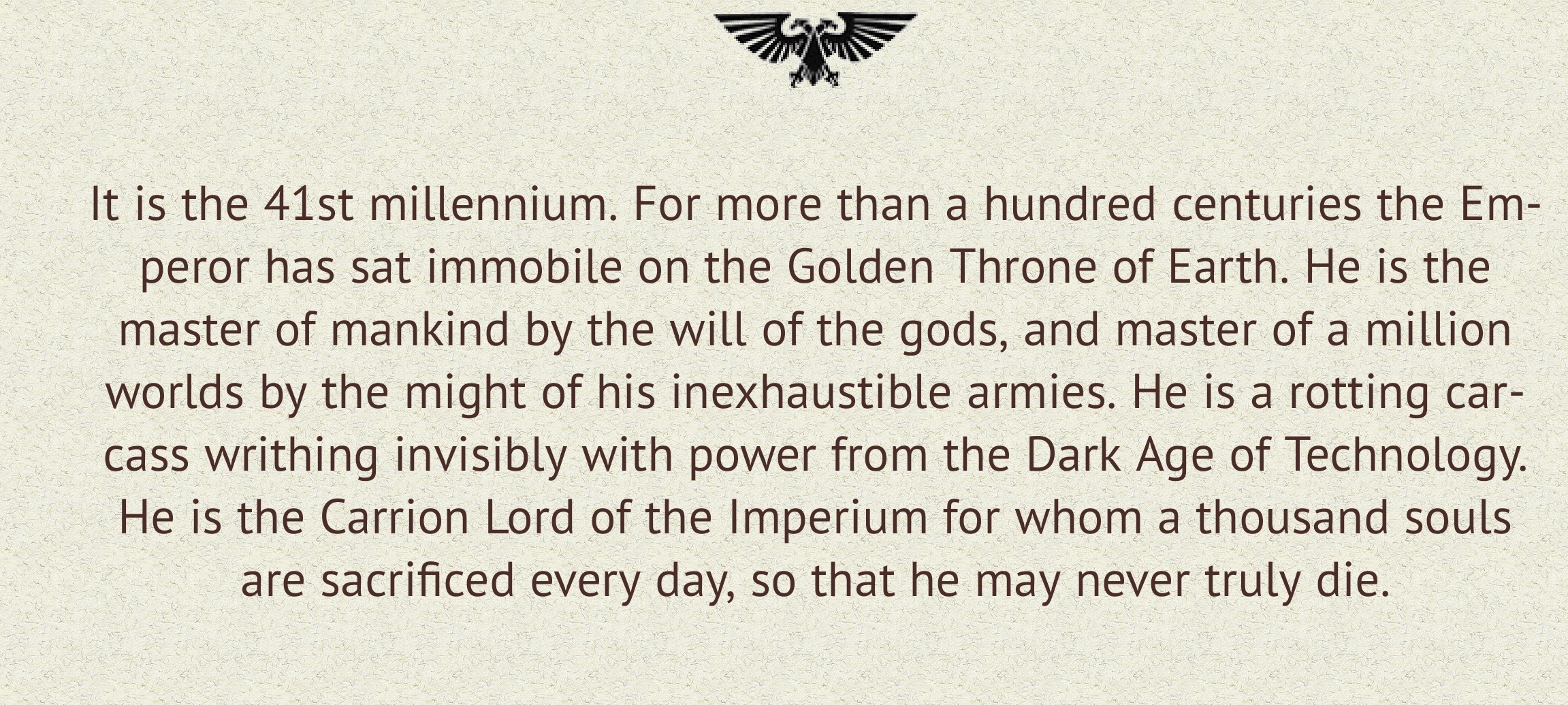 >>1106960 Когда Император только появился на Терре, все строилось из глины (опционально - из говна с соломой). Глиномес, говномес и их командир были самыми созидательными профессиями. Десятки тысячелетий спустя, Император построил Терру своей мечты и детских восторгов - полную орлов, золота, с планами к которым Он прикладывал свою руку - и ордами специально выведенных Боссов Качалки.