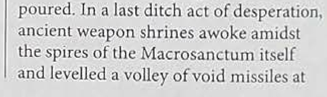 The Voidclaw is an ancient Dark Age of Technology-era weapon on Vigilus. Existing in the center of the Citadel Vigilant, itself inside a massive near-impenetrable storm known as the Vhulian Swirl, the weapon was lost to Imperial records but during the War of Beasts was eventually captured by a band of Fallen under the Librarian Osandus. The weapon did not fire projectiles, instead forcing a breach in space-time to bring a beam of crushing energy upon a single point. This energy opened up a minuscule singularity that could bypass all types of force fields and barriers, unleashing a devastating wave similar to the effect of a Black Hole.[1] During the War of Beasts, Abaddon himself journeyed to the Citadel Vigilant to claim the power of the Voidclaw in a bid to reshape the Nachmund Gauntlet. He fired the Voidclaw between Vigilus and its moon, creating a devastating wave of gravitic force that became known as the Vhulian Anomaly.[1] Sources 1: Imperium Nihilus: Vigilus Ablaze pg.22-24