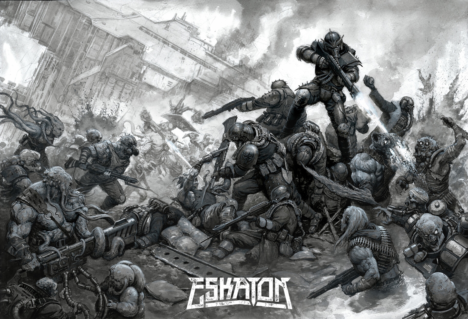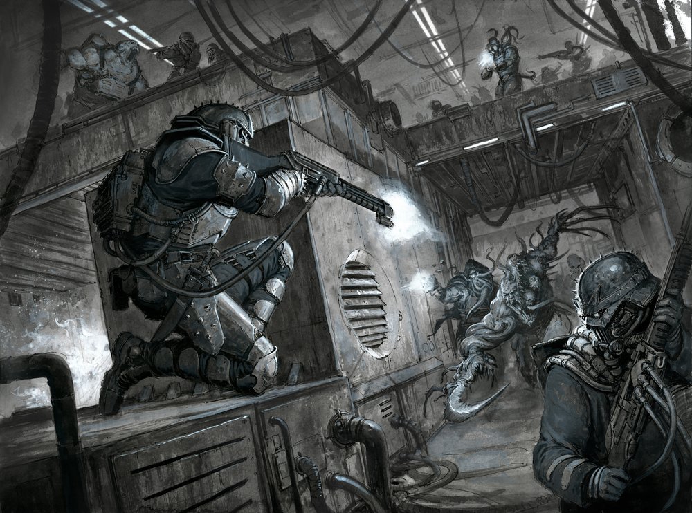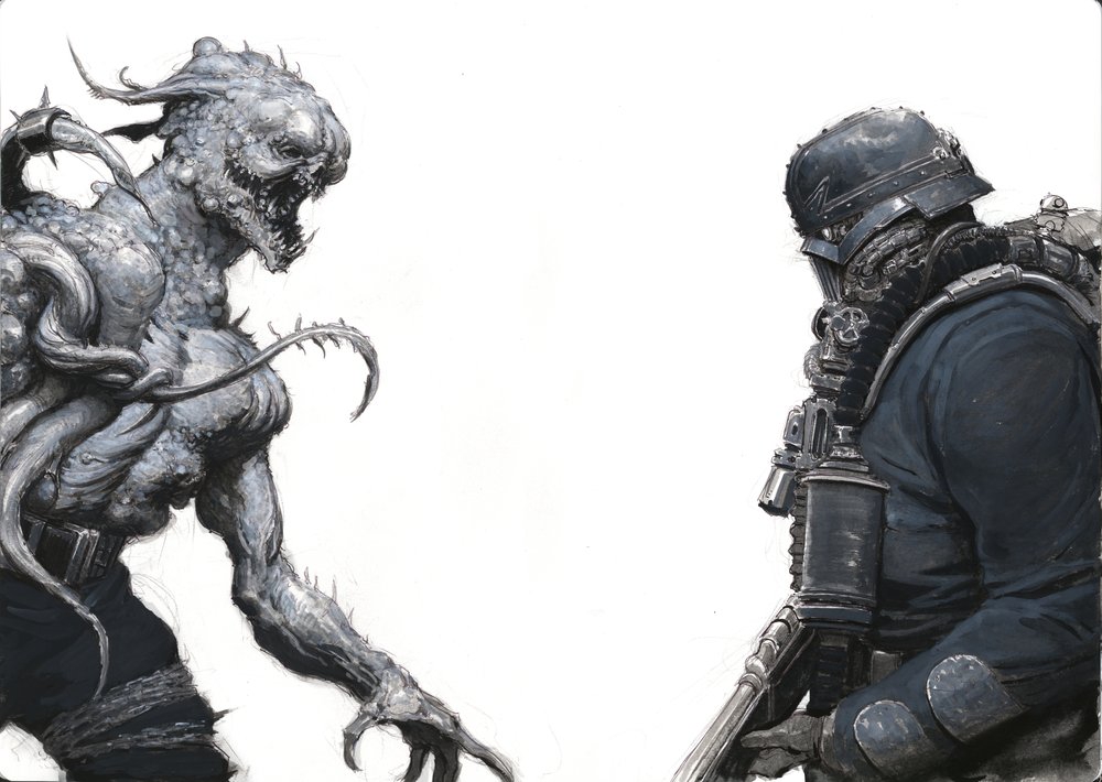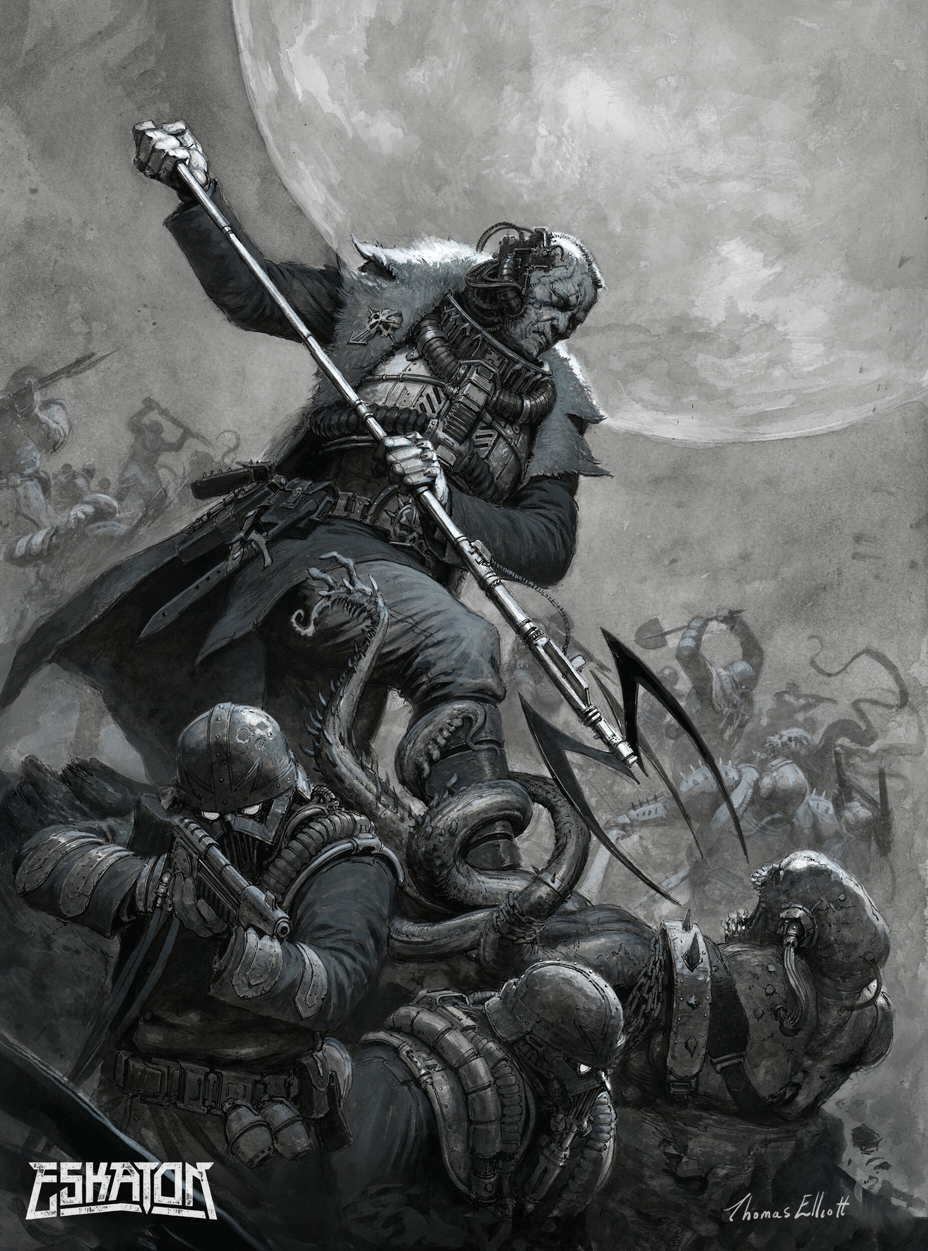 Томас Эллиотт, работавший пять лет на ГВ, ушел на вольные хлеба, и пилит собственный гримдурк-сеттинг Eskaton, идею которого он вынашивал с худшколы. А всё потому, что он вахаебствовал, но, как художник, не хотел малевать фанарты по вахе. В Эскатоне стагнирующее человечество разбросано по изолированным планетам, межзвездные перелеты сложны и редки, а галактика полна ужасов. Для художника сеттинг - это песочница с бесконечным потенциалом, в которой могут существовать самые безумные персонажи и миры.