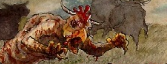 Instead of raising the banner to signal another charge he pointed to the crest of the hill at his back as the moon rose behind it. Over the ridge came daemons with blood-soaked skin bearing huge axes and swords. They rushed at the Storm Giants and we followed. The Warriors of the Gods clashed and normal men were hurled about by the power they unleashed. I staggered into the press clutching a broken lance. Flaming winds cast me down but I pressed on and thrust my lance into the first of the Storm Giants I could reach. I struck him where his armour was twisted and melted. He fell and as he did the Prophet leapt upon him and with glowing blade cut him open and pulled the organs from his body. He held his bloody prizes aloft and told me that immortality beckoned me.
