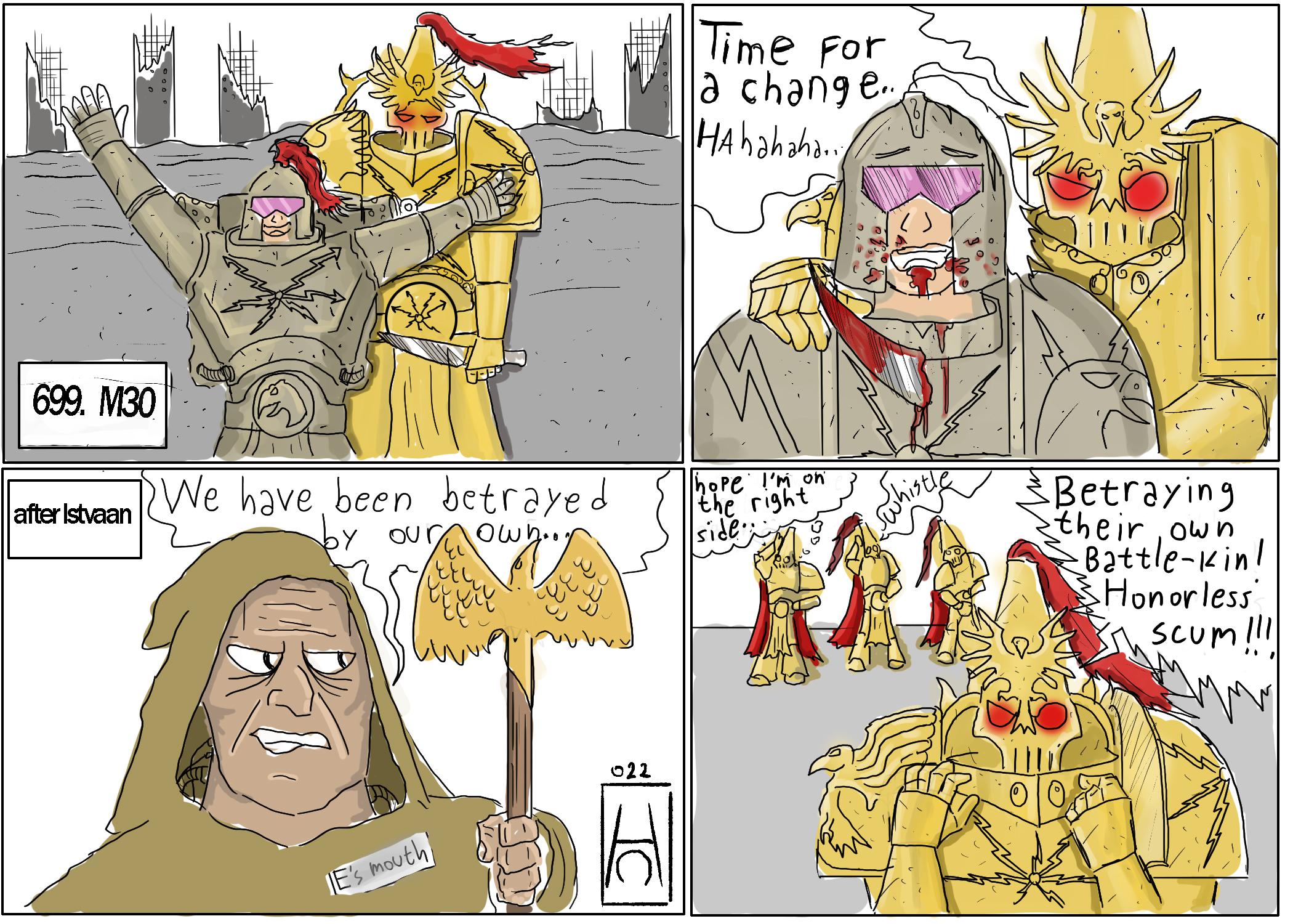 >>1133225 Говоря об Армагеддоне - конкретно там от свидетелей избавлялись не просто из-за встречи с Хаосом, а из-за встречи с демоническим примархом, - а это мало того что запретное знание, так еще и самое лютое средоточие порчи, - даже в отсутствие Ангрона монолиты на Армагеддоне продолжали влиять. Плюс Серые Рыцари - из-за секретности ордена свидетели всегда устранялись. >Знают ли простые люди о легионах предателей? Простые люди не знают не то что о легионах-предателях, а даже могут не знать ничего о ксеносах. Это кстати позволяет не сильно затронутым Хаосом хсмам как например альфариям или ночникам выдавать себя за имперских гомокочек, ичсх это работает. >И есть куча конфликтов где например людям по всему сектору известно кто такой Абаддон даже на диких мирах(Готическая вйона и книжки по ней). Готическая война и вообще все ЧКП происходили в Сегментуме Обскурус, так что его жителям, и особенно жителям Кадийских Врат просто не может не быть не известно кто такой Абаддон, - там им буквально с детства пугают, в книжке "Кадия стоит" такой момент был.