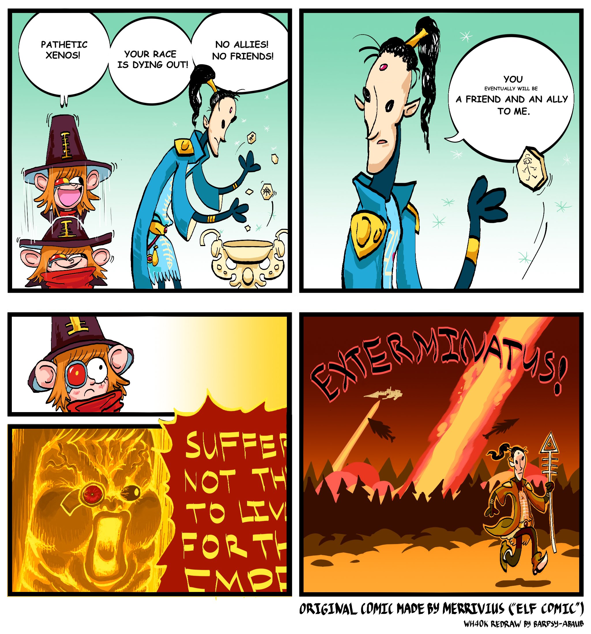 > Но ведь до расцвета Хаоса в ВКП уже была доктрина истребления с редкими исключениями Именно потому что Император знал о грядущей войне с Хаосом и решил уничтожить как можно больше посторонних сил, которые при прошлом кризисе людей в основном предали. ( о целях и методах Императора тут >>1130334 →). И, видимо, был прав, потому что во время Ереси ксенофракция Кабал (состоящая как раз таки из эльдаров и прочих довольно вменяемых видов) нехило помогла хаоситам, решив уничтожить опасный человеческий вид.
