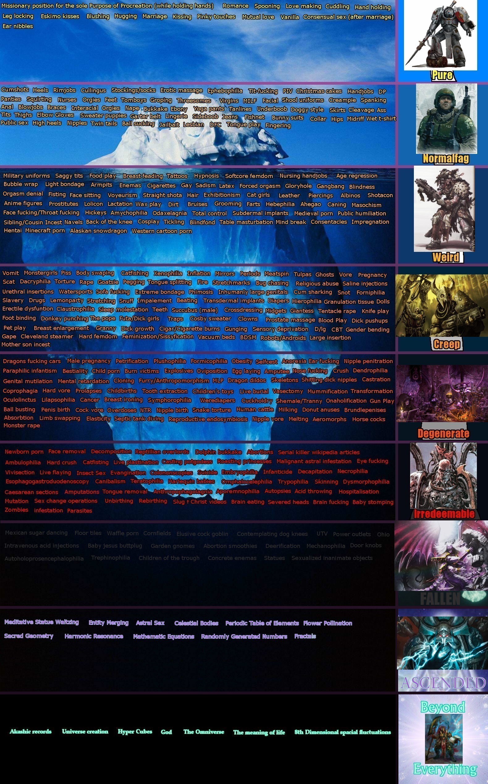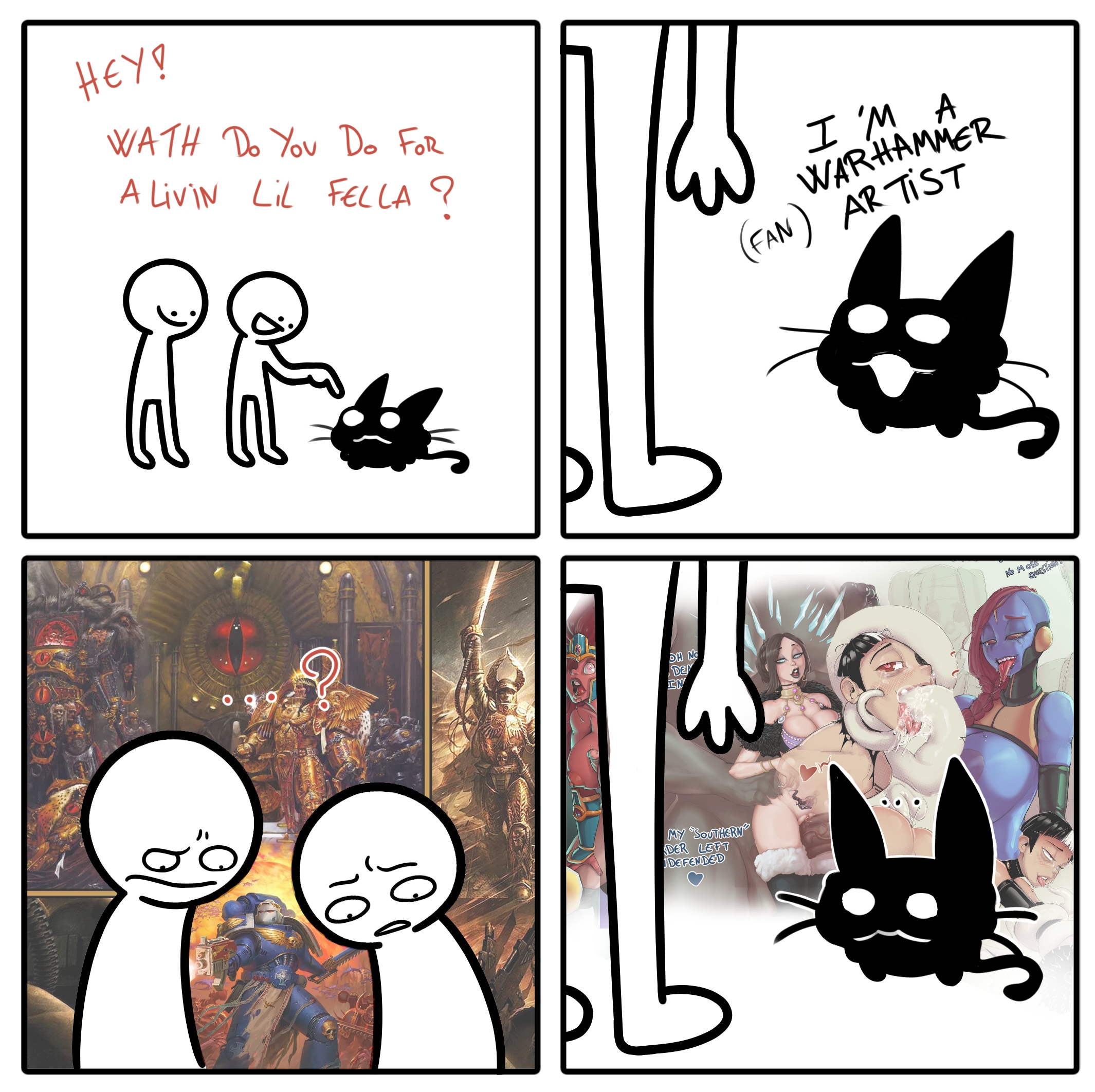 Дорогой неофит, если ты зашёл на эту доску и ищешь картинки в хайрезе или пдфки кодексов, то погоди создавать тред с реквестом, написанным КАПСБОЛДОМ, лучше спроси в треде картинок/литературы. Актуальные ссылки всегда висят в шапке раздела. Если ты не понимаешь каких-то вещей, у тебя есть вопросы, ты жаждешь знаний по бэку/настолке, то смело спрашивай тут, и мимопроходящие вахаёбы постараются ответить на него в меру своей упоротости/дивности. И не забывай о Лексикануме, он зачастую знает больше анона: http://www.lexicanum.com/ Для настольщиков: https://wahapedia.ru/