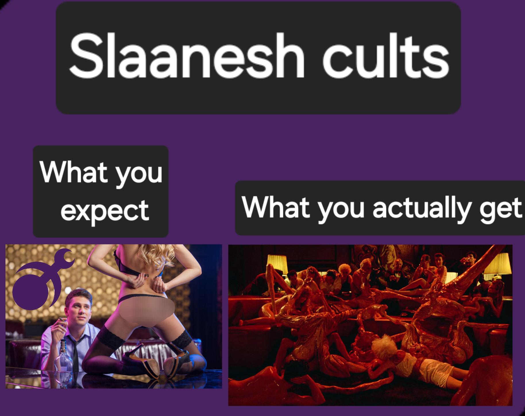 >>1131887 Слаанеш изначально про секс, наркоту и рок-н-ролл, даже в её имени. По крайней мере, так говорил Анселл про то, как придумывали богов хаоса. >Slaanesh was meant to be a sibilant, erotic, breathy, whispered/murmured sound. The models didn't turn out quite as erotically charged as I'd hoped. Про хорошо покушать это уже нюлор и соефикация, потому что надо продавать детишкам и пуританским островным/заокеанским пидорашкам.