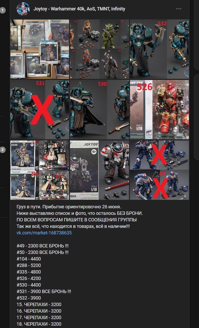>>1135304 В районе 2-3 косарей на фигурку. Ну вот примерно в ноябре они и должны появится на всяких Озонах и прочих. Не трясись, Джои никто не скальпит особо, минус единичные фигурки, они там полгода после релиза или больше лежать будут. Насчет предзаказов в РФ были всякие группы в Вконтакте, типо таких https://vk.com/joytoy40k >Они постепенно выкатят разнообразный модельный ряд или это затянется на годы вперемешку с другими релизами? Там все непонятно, все зависит насколько тесно Джеймс Воркшоп сотрудничает с ДжойТой. По-хорошему они должны выкатить Пертурабо, их уникальный скульпт Контемптора и может еще автоматонов Железного Круга, если повезет. Еще может втиснуться новый Варсмит/Претор, которого ГВ показывали 5 месяцев назад. Думаю анонс нового Mk2 придется как минимум полгода ждать, если не больше, ибо его буквально вчера сами ГВ показали. Это если исключить возможность, что ГВ заранее Джоям передали файлы (сомнительно). >или это затянется на годы вперемешку с другими По сути да. Вот смотри, как релиз Альфа Легиона шел: Февраль 2025 анонс Альфария, их уникального Дреда и Консула Саботера Март 2025 анонс Харроумастера и Претора Апрель 2025 анонс Терминатор Претора и Лернейских Терминаторов Май 2025 анонс Эксодуса и Хедхантеров Параллельно с ними была ДОХУЯ анонсов по другим линейкам.