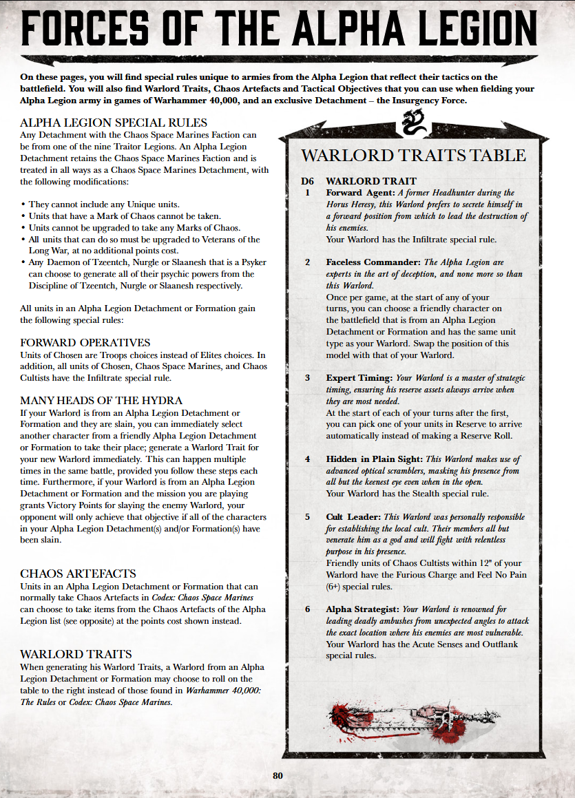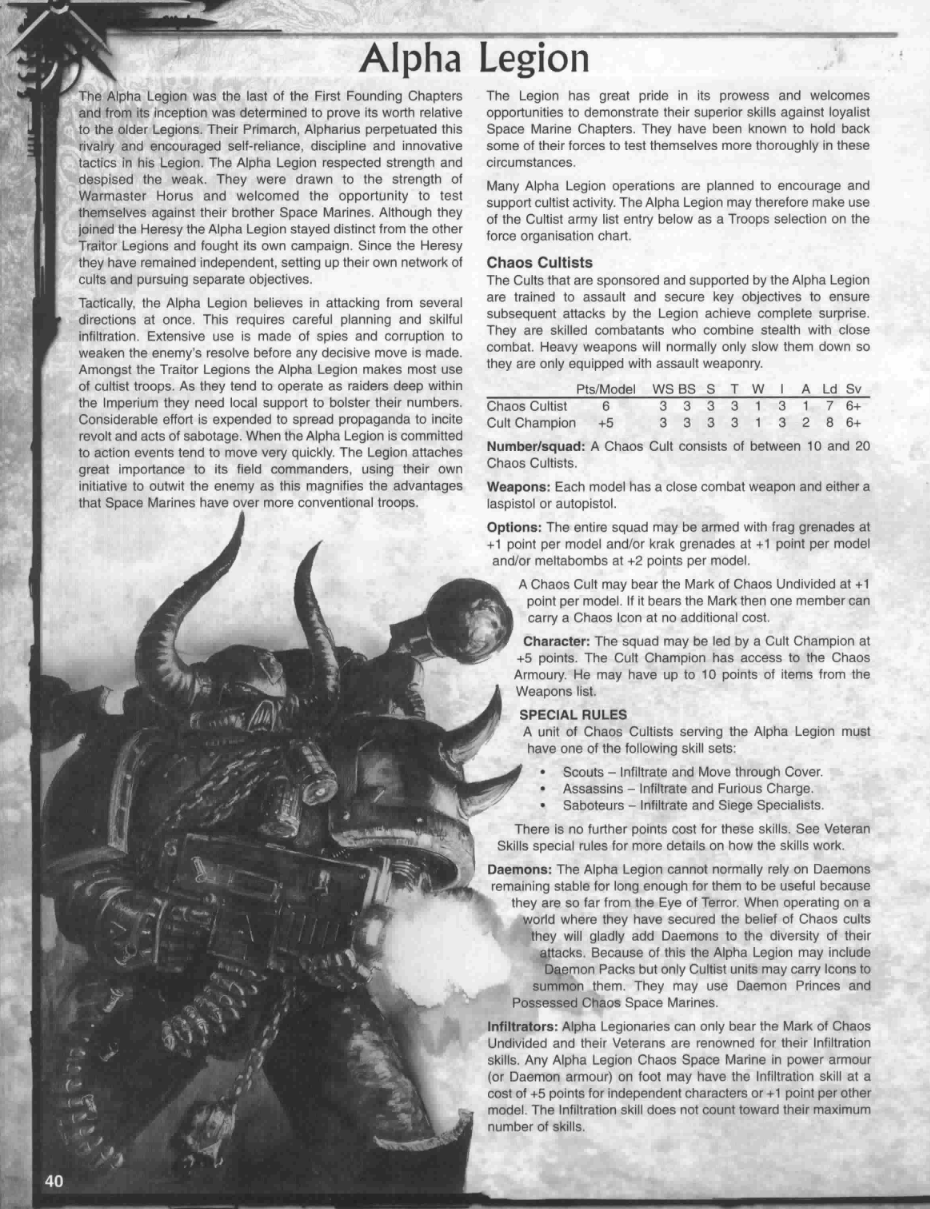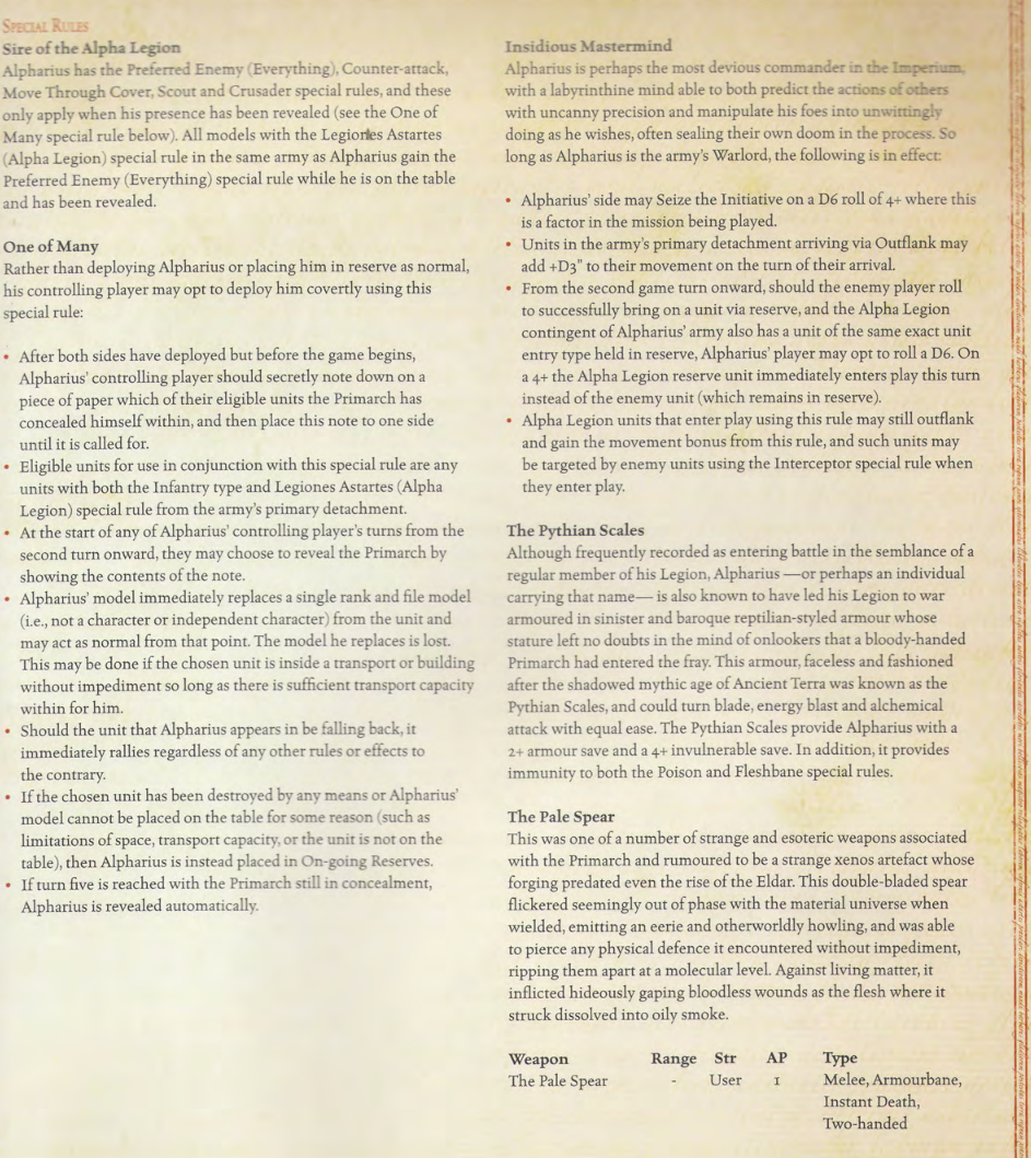 >>1140031 >были ли предатели среди человеколюбивых саламандр Да, было и такое >Обратившиеся на службу магистру войны Саламандры, которые покинули своего прежнего господина, стремятся испепелить узы, что когда-то связывали их с Императором, во всепожирающем пламени. На поле битвы их рвение к службе новому хозяину становится очевидным в следе из пепла и разрушений, остающемся после них. >ультрамаринов >Несмотря на успехи в воинском ремесле и громадное королевство, которое они построили для далёкого Императора, некоторые из Ультрадесантников никогда не чувствовали, что удостоились похвалы, достойной своих достижений. Хотя практически никто в легионе не одобрял разрыва со своим почитаемым примархом, нашлись некоторые, кто счёл, будто бы легион сможет занять более подходящее положение в любом новом Империуме – и что хаос Ереси Гора являет собой шанс для легиона установить своё господство и продемонстрировать всей Галактике истинный характер Ультрадесантников. >[1] Тем не менее, единственный должным образом прописанный момент с предательством внутри Тринадцатого в годы Ереси Гора описывается в статье «Битва за Калт: Война в подземном мире / The Battle of Calth: Underworld War». Краткое упоминание предательских Ультрадесантников также содержится в книге «Теневые войны: Битва за Бету Гармона» («искажённые или испорченные обрушившиеся на них пагубной энергией») – отмечено, что они сражались против собственных собратьев и впоследствии бежали вместе с отступающими силами Несущих Слово, продолжая наносить удары по владениям лоялистов на протяжении всей Ереси Гора, однако их имена, подразделения и подробные обстоятельства измены всё же остаются неизвестными.