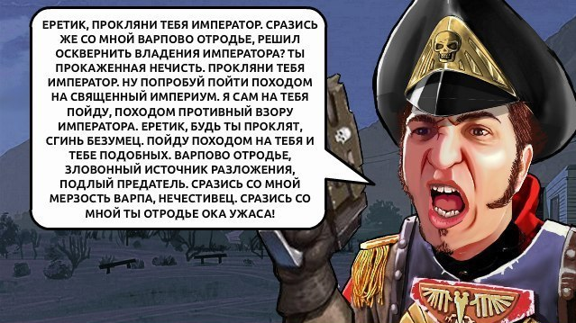 На Срачетред он полез из-за военных заводов. Их там весьма дофига, хотя планета приналежит ИГ, а не АМ. Здесь небольшое отступление: Двачемарины выбили у имперских властей планету и подарили ее своим любимым союзникам, чтобы те имели постоянную базу для тренировок, "свои" заводы (для этого заключили контракт с довольно радикальной группой Механикумов, согласившейся подчиняться ИГ в обмен на эксперименты с ксенотехом - отсюда, кстати, растут ноги у бунта Болодебила), ну и чтобы вообще мытищенцы стали более независимы от Муниторума. Удалось даже сделать так, что планетарным губернатором мог стать только генерал-милитант Мытищенских полков. В секторе на все это закрывали глаза из-за связи с Астартес. Равнодушно отнеслись и к тому, что крепость Манямир, нужная для защиты планеты от бомбардировок с орбиты, была возведена с использованием неконвенцинальных технологий - отсюда конфликт между руководством системы и адмехами с кузни Конверсач, откуда когда-то отпочковались предшественники Болодебила.