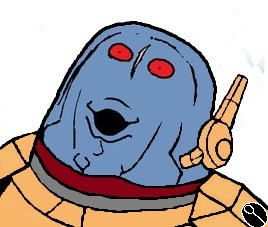 У техножреца заменена металлом большая часть тела, кроме нижней челюсти и больших пухлых губ, придающих ему сходство с рыбой. Hа красном плаще изображен символ его мира-кузни, не знакомый никому из вас. Периодически техножрец встает на колени и смачно целует губами коробку-когитатор автопилота, что не может не настораживать.