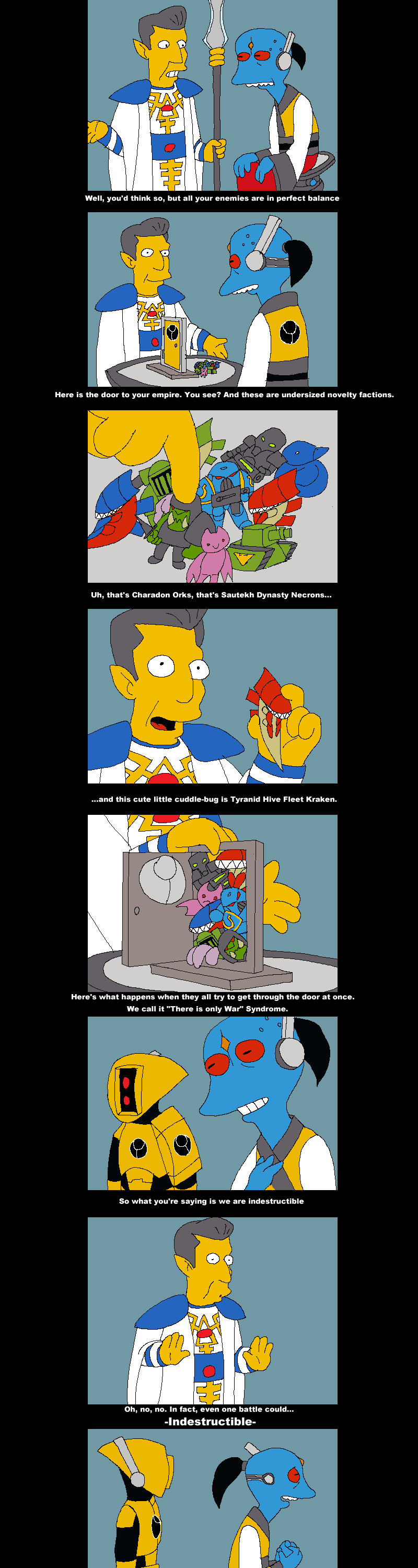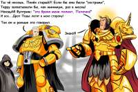 -Воитель Хорус, это послы мирной планеты, они хотели войти в Империум. -А, что там? А, ну запускайте. прошло пять минут, слышны болтерные очереди -Тратататататп! Не, ну ты видел, видел? Как он на меня смотрел? Я кто ему? Я Воитель! Воитель, блять! Разбомбить их!