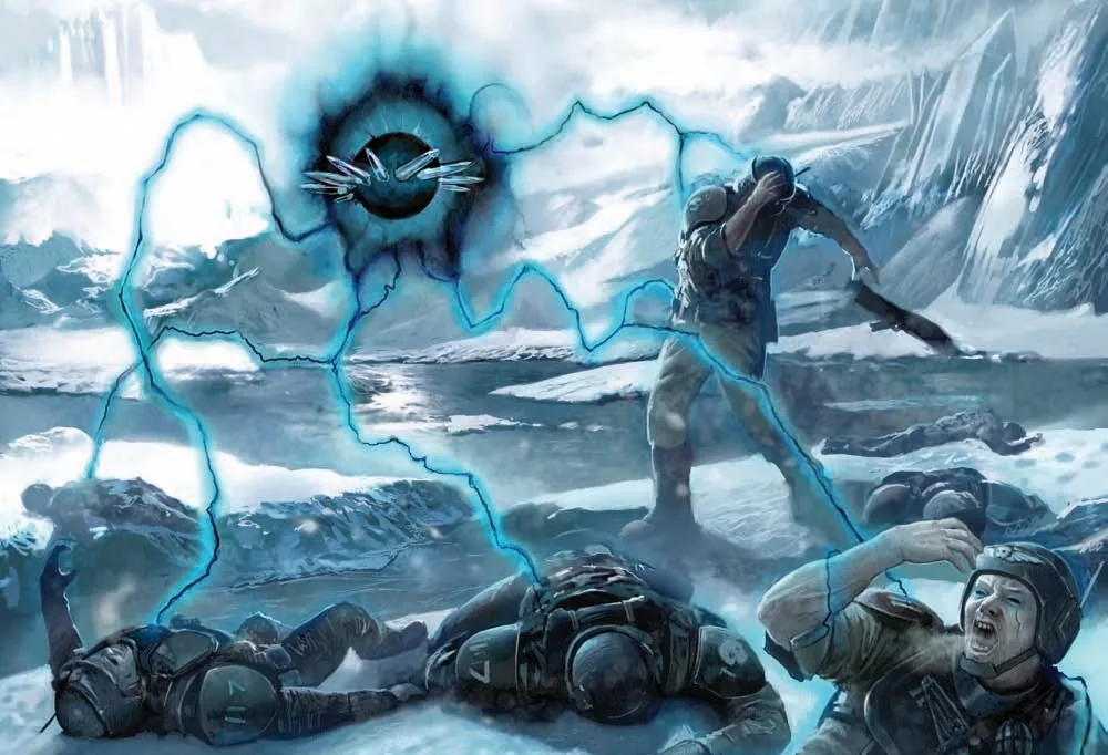 Они остановились в ста метрах над землёй и радиолокационные картографические ауспики приступили к сканированию поверхности. Системы маневрирования произвели корректирующие выбросы, одновременно раздалась канонада установленных в нижней части корпуса вращающихся орудийных комплексов, способных расколоть поверхность планеты. Пока открывались широкие круговые двери мелта-печей, меткие выстрелы оглушительными залпами разбили лёд на куски приемлемого размера.