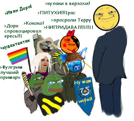 Пасту про гусеницу переписали в 40000й раз, а мы смеемся и просим написать в 40001й. БЛяди кладут хуй на бэк, само ГВ сливает Ваху в унитаз, жирухи пишут свои блядские фанфики — мы смеемся. Унижение некронов, поиск хохлов, обсуждения, кто кому петух, кто пидор, а кто еще больший пидор, распределение примархов по зоновским кастам — мы смеемся. Императора записали в тираниды — мы смеемся. Мы бездушно подпишемся под чем угодно, наши предпочтения не основаны на здравом смысле, бесцельные споры — наша стихия, мы — истинное лицо ваха-комьюнити.