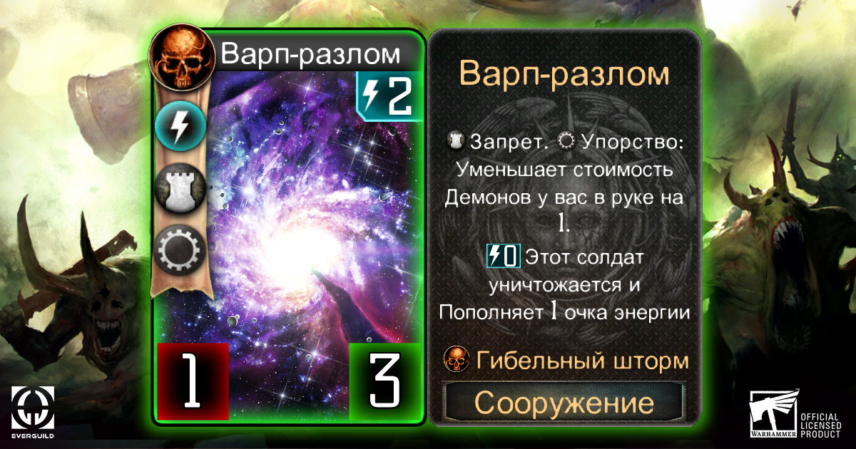 Ладно, дейлики откатал. Пошел в эвент - и скажу, колоды у Сани сосут. Три победы только сделал, два одинаковых сценария поражения: финишная прямая, у меня на руке две карты - БУРОВАЯ УСТАНОВКА, ВАУ, ЧТОБ Я БЕЗ НЕЕ ДЕЛАЛ, и... и... как думаете, что? Обход с фланга для солдат в руке!!! Охуенно, не правда ли? Если вам выпал Саня - только Черный Гнев, остальные колоды СОСУТ, причем не кровь. С сундуков все равно лега выпала, примарх. Мортарион, блядь. Я уже понял принцип их выпадения: игра смотрит, карт чьего легиона у меня меньше всего - и даёт их примарха, в прошлый раз выпал Вулкан.