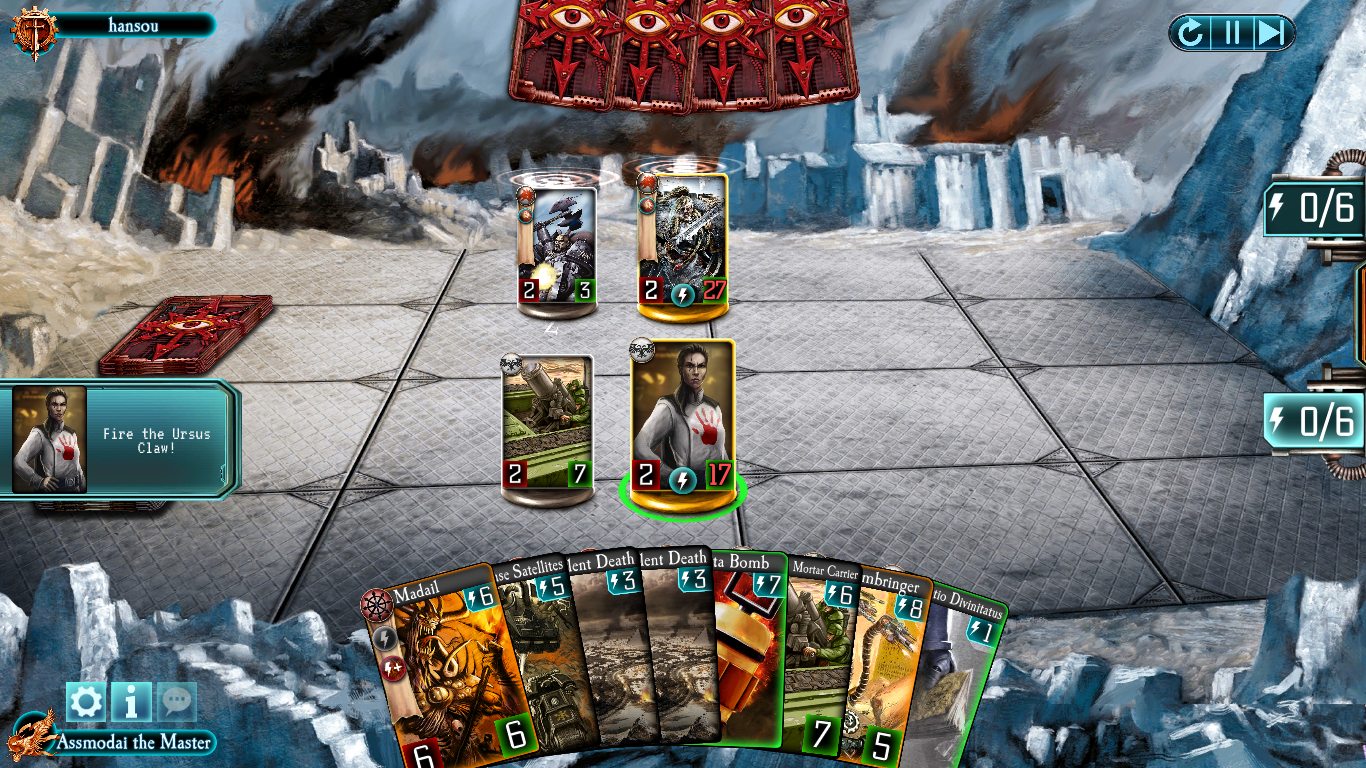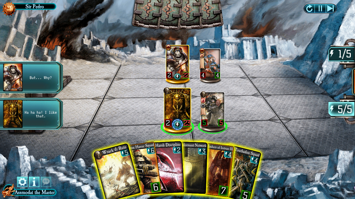 >У них есть прекрасная карта - стражи, но они и так в стелсе. А умбру кидают в связке с мор дейтаном на столе, чтобы 1+1, 6+1 и 6+1 кинуть. Но это до завоевателя отыгрывается. И умбра с морадусами или даже двумя в руке, и мор дейтан на столе, это супер-заход какой-то, ну или вагон промотанной колоды, что с Ангроном можно и не успеть. Суть в том, что Ангрону еще надо чистить стол противника, не чистит - ну что ж, дело их, я таких жабами убивал к 7 ходу. Вот ставит ворон 3/5, который приговор кидает - и что, игнорировать его? Нет, конечно, надо убить, но вулканы не осилят, да и стоит ли отдавать вулканы на одну цель да еще не в стелсе? Рывки тоже жалко, да и везде надо лицом добивать. В итоге ты выбрал Вулканы, Коракс потерял 3 хп и одну тушку, а ты 6 хп, если и дальше так пойдет - ворон вполне способен будет на летал из руки наскрести.