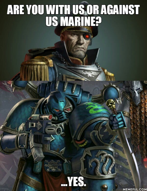 >>45864 -Идут Кровавые Ангелы -О, это наши, да? -Нет, это лоялисты. А вот еще Расчленители -Ну эти точно наши -Нет, лояльный легион. А вот идут Черные храмовники -Н... -Нет, снова лоялисты. А вот Пьющие Души... -Ну это точно... -И снова мимо. А вот Дети Императора -Ну это точно лоялисты -Не, вот эти как раз наши.