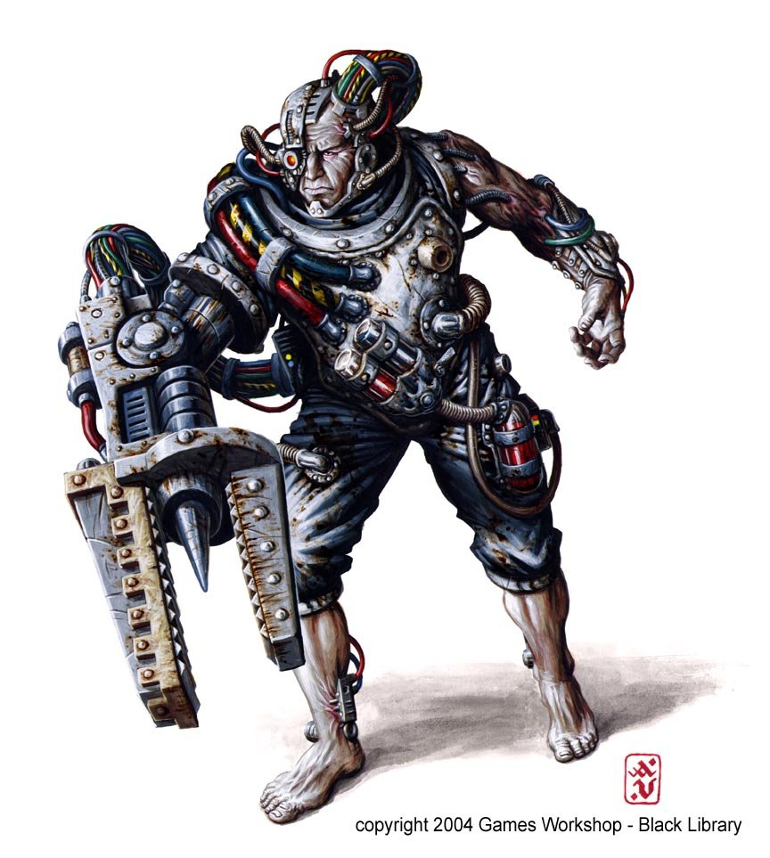 …Все началось в тот день, когда босс Горгутц самолично открутил голову предводителю шипастых жестянок (гордо называвших себя Десантниками Хаоса) и подобрал его позолоченный топор, на редкость удачно выполненный в виде ухмыляющейся пасти. Инстинкт самосохранения и банальный орочий здравый смысл в один голос пытались уговорить Горгутца не брать эту штуку, но не менее банальная орочья жадность тут же велела обоим заткнуться. Радость от обладания новой игрушкой длилось ровно полторы минуты - до того момента, как топор после первого замаха самым подлым образом выскользнул из лап нового хозяина и рубанул по правому запястью. Нельзя сказать, чтобы Горгутц сильно расстроился из-за потери руки. Через пару часов док Скаргоб, подпольно промышлявший производством киборков и съевший не одну сквигособаку на замещении плоти железом, обогатился на мешочек золотых зубов, а Горгутц вышел из его палатки, потрясая огромной боевой клешней. Видимо, топору новый протез понравился не меньше, чем владельцу, поскольку он тут же выскочил из-за пояса и отрубил левую руку пониже локтя. Зажимая рану подвернувшимся под руку гретчином, Горгутц крепко призадумался… На следующий день идея одновременного кромсания противника двумя клешнями и топором доказала свою несостоятельность - вместо вражеских голов злосчастный трофей откромсал хозяину обе ноги, а затем подскочил и произвел любительскую трепанацию черепа, не задев мозг исключительно из-за скромных размеров оного. Видимо, мысли Горгутца обрадовались солнечному свету и свежему воздуху, поскольку на босса в тот момент снизошло озарение. Когда его тащили к палатке дока, Горгутц довольно ухмылялся. Он вспомнил, ЧТО хранилось в подсобке у Скаргоба на случай Особого Заказа… Спустя пару дней весь лагерь только и говорил, что о новом приобретении босса Горгутца. Слегка ошарашенный весом врученного ему мешка с зубами и крепостью прилагавшейся в качестве бонуса грибной самогонки, док Скаргоб выложился на все сто, соединив изуродованное тело своего клиента с могучей шагающей машиной, вооруженной шикарными циркулярными пилами. Глупые людики, у которых этот агрегат был отбит в свое время, использовали его не по назначению - для рубки леса, но орочий военный гений быстро нашел ему куда более достойное применение. Скаргоб так увлекся увешиванием заказчика колюще-режущими предметами, что не заметил, как запасы обрезков железа подошли к концу, и срезанную макушку Горгутца пришлось прикрыть медной воронкой. Босс не мог нарадоваться на свое новое тело - ему раньше и в голову не могло придти, что кромсать врага четырьмя руками вместо двух значительно быстрее, удобнее и веселее! Его не особенно смущала даже новая кличка "Железный Дроворуб", придуманная каким-то гретчином, прознавшим о происхождении агрегата. Однако Скаргоб все-таки подложил своему клиенту свинью (а то и целого сквигокабана), сэкономив на изоляции. Во время похода от первого же ливня Горгутца закоротило. Бывшие подчиненные, посовещавшись и выбрав нового вожака, двинулись дальше, оставив своего экс-босса ржаветь под тугими струями…