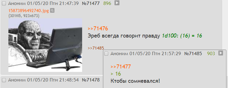 Кубы, явите свою волю. Что будет с нами? Придут правильные анончики - с гомофорсами, креативностью и весельем в лучших традициях ЖВТ 1d100: (22) = 22 Придут уебки всех мастей вдобавок к Чудищу 1d100: (50) = 50 Два в одном, как следствие - Истваан/Кадия 1d100: (49) = 49 Никто не придет и раздел тихо вымрет 1d100: (7) = 7