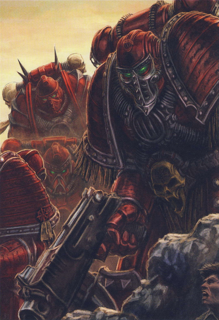 >Каждая новая кампания была новым испытанием, тонкой проверкой, выбранной двумя примархами с острым пониманием для излечения ран, что были нанесены легиону временем и судьбой. Сангвиний вселил в своих сынов новое чувство гордости, гордости не простой бойни и пропитанной кровью бесконечности ближнего боя, но гордости за будущее, в котором они станут образцом Императорского Кредо, равными воинам самого Гора. Во время годовой осады Анаксиса XII они осознали ценность братства, когда стояли плечом к плечу с Имперскими Кулаками наперекор приливу хрудов, которым, казалось, нет конца; на Камбриоле и Прехальте они обучились дисциплине, скрестив клинки с загадочными эльдарскими налётчиками, в то время как на Кентавре Бета они узнали кое-что о милосердии, когда Сангвиний повёл их на бескровное умиротворение кентавранских колоний. С каждым сражением легион избавлялся от части стигматов своего прошлого и делал первые нерешительные шаги по новому пути.